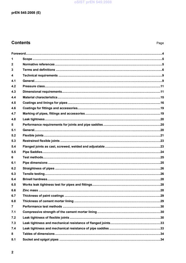 oSIST prEN 545:2008 is a draft published by the Slovenian Institute for Standardization (SIST). Its full title is "Ductile iron pipes, fittings, accessories and their joints for water pipelines - Requirements and test methods". This standard covers: This European Standard specifies the requirements and associated test methods applicable to ductile iron pipes, fittings, accessories and their joints for the construction of pipelines: - to convey water (e. g. for drinking water pipelines, fire protection, snow guns, irrigation, hydroelectric, reused water pipelines, etc…) - with or without pressure ; - to be installed below or above ground. This standard is applicable to pipes, fittings and accessories which are : - manufactured with socketed, flanged or spigot ends; - normally delivered externally and internally coated ; - suitable for fluid temperatures between 0 °C and 50 °C, excluding frost. This standard covers pipes, fittings ast by any type of foundry process or manufactured by fabrication of cast components, as well as corresponding joints and accessories, in a size range extending from DN 40 to DN 2 000, inclusive. This standard specifies requirements for materials, dimensions and tolerances, mechanical properties and standard coatings of ductile iron pipes and fittings. It also gives performance requirements for all components including joints. Joint design and gasket shapes are outside the scope of this standard. In addition reference is made to the performance requirements of couplings, flange adaptors and saddles manufactured only for use with ductile iron pipes and fittings NOTE In this standard, all pressures are relative pressures, expressed in bars (100 kPa = 1 bar).