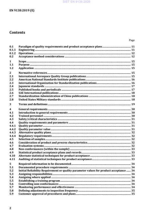 1.1 Purpose This European standard establishes requirements when implementing statistical product acceptance methods to meet defined risk requirements. This standard also establishes the minimum content required to be covered in an organization’s documented procedures that govern their application of statistical product acceptance methods. These general requirements and documented procedures apply the requirements of the EN 9100/EN 9110/EN 9120 quality management system standards, in addition to establishing requirements for retrievability, safety/critical characteristics, and quality parameters that protect the customer. 1.2 Application This standard is applicable when invoked in a purchasing contract or specification, contractual document, customer agreement, or adopted by the organization. The purchase contract/agreement may or may not identify the appropriate EN 9138 clause(s) to be applied by the organization. All statistical methods of product acceptance require the use of Clause 4 and Clause 5. To accept product produced: - by individual lots, see Clause 6; - under switching rules, see Clause 7; - under process controls, see Clause 8; and - by continuous sampling or special case methods, see Clause 9.