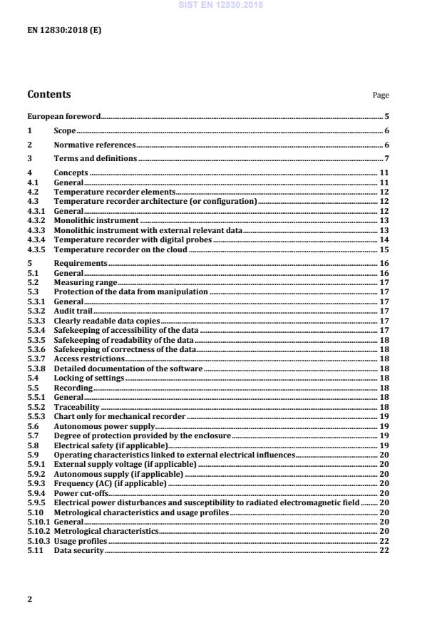 ; — New subclause 6.7 "Software test" and the related Annex A "Software testing" and Annex B "Manufacturer software test form" were added; — New Annex D "Expected operation time and storage capacity" and Annex E "Required access to recorded data or functions" were added. This European Standard is a document meeting the objectives of Directives: — 92/1/EEC of January 13, 1992 of the Commission on the monitoring of temperatures in the means of transport, warehousing and storage of quick-frozen foodstuffs intended for human consumption; — 93/43/EEC of June 14, 1993 of the Council of the hygiene of foodstuffs and in particular on “temperature control criteria”. According to the CEN-CENELEC Internal Regulations, the national standards organizations of the following countries are bound to implement this European Standard: Austria, Belgium, Bulgaria, Croatia, Cyprus, Czech Republic, Denmark, Estonia, Finland, Former Yugoslav Republic of Macedonia, France, Germany, Greece, Hungary, Iceland, Ireland, Italy, Latvia, Lithuania, Luxembourg, Malta, Netherlands, Norway, Poland, Portugal, Romania, Serbia, Slovakia, Slovenia, Spain, Sweden, Switzerland, Turkey and the United Kingdom. SIST EN 12830:2018