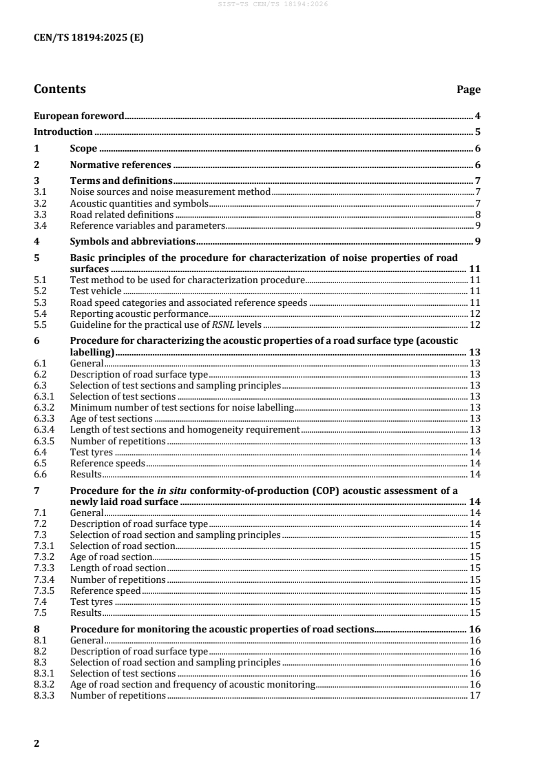 SIST-TS CEN/TS 18194:2026 is a technical specification published by the Slovenian Institute for Standardization (SIST). Its full title is "Road and airfield surface characteristics - Characterisation of the acoustic properties of road surfaces". This standard covers: This document describes an assessment procedure for characterising the effect of different pavement types on road traffic noise emission. The procedure relies on the application of an established measurement method and specifies the de-tailed conditions for its use to enable the determination of characteristic values for the acoustic perfor-mance of road surface types with a given accuracy. Performance is characterised in absolute terms ra-ther than with respect to a reference surface, as specifications for the latter differ from country to coun-try and could contribute to additional uncertainty. The procedure is intended to be suitable for the following applications: - for the acoustic labelling (i.e. the determination of initial acoustic properties) of generic or proprie-tary road surface products; - for the conformity-of-production (COP) assessment of newly laid surfaces, e.g. to assess compliance with acoustic labels and/or contract specifications, or to assess the homogeneity of the surface over its length; - for the monitoring of the acoustic properties of road surfaces over the course of their working life-time, so as to help inform surface maintenance/replacement policies and increase understanding of the acoustic durability of road surfaces. The values derived from this procedure are intended to be used for the following purposes: - to characterise the initial acoustic properties of a road surface type (the acoustic label) using a common procedure across Europe. Such an acoustic label can serve as a baseline for setting perfor-mance requirements in public procurements, COP assessments and monitoring over the working lifetime of the surface. The label enables the comparison of different road surface types in an unbi-ased manner; - to verify the acoustic quality and homogeneity of a newly laid road surface; - to determine the acoustic quality and homogeneity of a road surface at a given point during its working lifetime; the collation of sufficient data on the same surface over time enables the predic-tion of acoustic behaviour and can help to drive surface design/development. In addition, the procedure described within this document also makes possible: - the establishment of reference values for wider road surface types; - the derivation of input parameters for road surface corrections within environmental noise calcula-tion methods (in particular, the harmonised CNOSSOS-EU method).