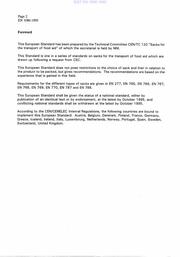 SIST EN 1086:1998 is a standard published by the Slovenian Institute for Standardization (SIST). Its full title is "Sacks for the transport of food aid - Recommendations on the selection of type of sack and the liner in relation to the product to be packed". This standard covers: This European Standard gives recommendations for the selection of type of sack and the liner in relation to the product to be packed for the transport of food aid.
