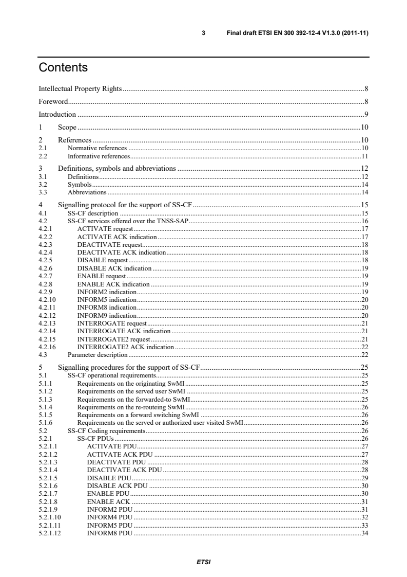 ETSI ETSI EN 300 392-12-4 V1.3.1 (2012-04) 3 Contents Intellectual Property Rights . 8 Foreword . 8 Introduction . 10 1 Scope . 11 2 References . 11 2.1 Normative references . 11 2.2 Informative references . 12 3 Definitions, symbols and abbreviations . 13 3.1 Definitions . 13 3.2 Symbols . 15 3.3 Abbreviations . 15 4 Signalling protocol for the support of SS-CF . 16 4.1 SS-CF description . 16 4.2 SS-CF services offered over the TNSS-SAP . 17 4.2.1 ACTIVATE request . 18 4.2.2 ACTIVATE ACK indication . 18 4.2.3 DEACTIVATE request . 19 4.2.4 DEACTIVATE ACK indication . 19 4.2.5 DISABLE request . 19 4.2.6 DISABLE ACK indication . 20 4.2.7 ENABLE request . 20 4.2.8 ENABLE ACK indication . 20 4.2.9 INFORM2 indication . 20 4.2.10 INFORM5 indication . 21 4.2.11 INFORM8 indication . 21 4.2.12 INFORM9 indication . 21 4.2.13 INTERROGATE request . 22 4.2.14 INTERROGATE ACK indication . 22 4.2.15 INTERROGATE2 request . 22 4.2.16 INTERROGATE2 ACK indication . 23 4.3 Parameter description . 23 5 Signalling procedures for the support of SS-CF . 26 5.1 SS-CF operational requirements . 26 5.1.1 Requirements on the originating SwMI . 26 5.1.2 Requirements on the served user SwMI . 26 5.1.3 Requirements on the forwarded-to SwMI . 26 5.1.4 Requirements on the re-routeing SwMI . 27 5.1.5 Requirements on a forward switching SwMI . 27 5.1.6 Requirements on the served or authorized user visited SwMI . 27 5.2 SS-CF Coding requirements . 27 5.2.1 SS-CF PDUs . 27 5.2.1.1 ACTIVATE PDU . 27 5.2.1.2 ACTIVATE ACK PDU . 28 5.2.1.3 DEACTIVATE PDU . 28 5.2.1.4 DEACTIVATE ACK PDU . 29 5.2.1.5 DISABLE PDU . 29 5.2.1.6 DISABLE ACK PDU . 30 5.2.1.7 ENABLE PDU . 31 5.2.1.8 ENABLE ACK . 31 5.2.1.9 INFORM2 PDU . 32 5.2.1.10 INFORM4 PDU . 32 5.2.1.11 INFORM5 PDU . 33 5.2.1.12 INFORM8 PDU . 34 SIST EN 300 392-12-4 V1.3.1:2012