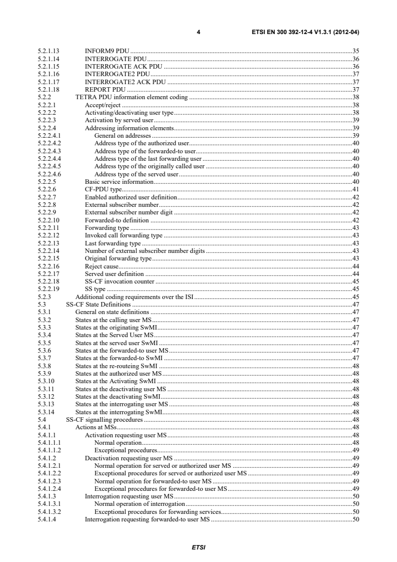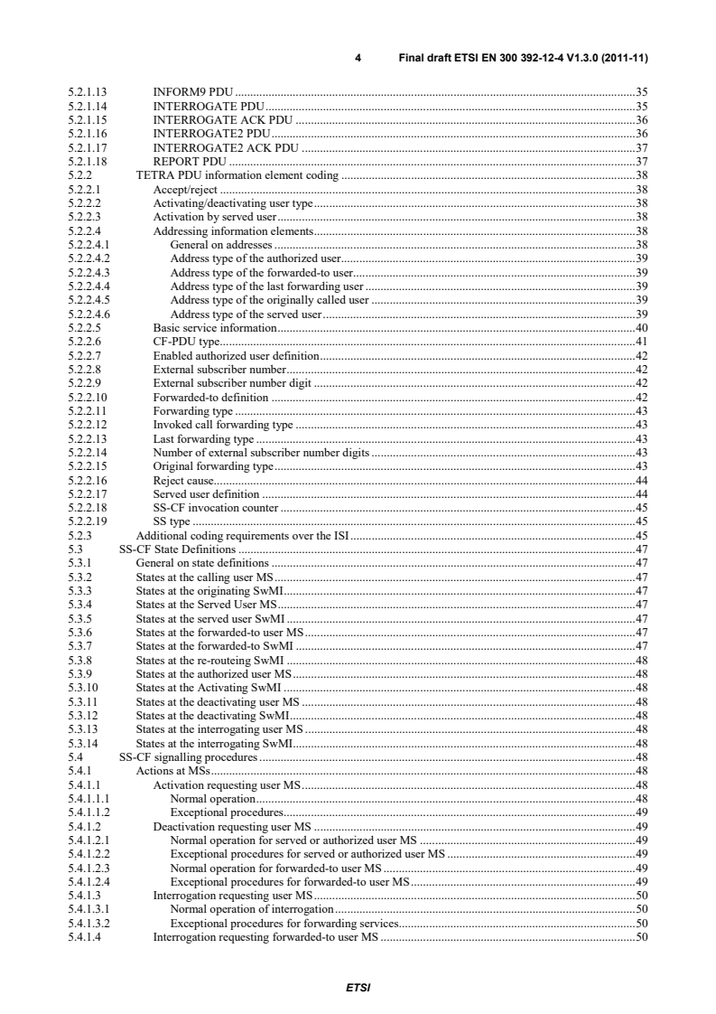ETSI ETSI EN 300 392-12-4 V1.3.1 (2012-04) 4 5.2.1.13 INFORM9 PDU . 35 5.2.1.14 INTERROGATE PDU . 36 5.2.1.15 INTERROGATE ACK PDU . 36 5.2.1.16 INTERROGATE2 PDU . 37 5.2.1.17 INTERROGATE2 ACK PDU . 37 5.2.1.18 REPORT PDU . 37 5.2.2 TETRA PDU information element coding . 38 5.2.2.1 Accept/reject . 38 5.2.2.2 Activating/deactivating user type . 38 5.2.2.3 Activation by served user . 39 5.2.2.4 Addressing information elements . 39 5.2.2.4.1 General on addresses . 39 5.2.2.4.2 Address type of the authorized user. 40 5.2.2.4.3 Address type of the forwarded-to user . 40 5.2.2.4.4 Address type of the last forwarding user . 40 5.2.2.4.5 Address type of the originally called user . 40 5.2.2.4.6 Address type of the served user . 40 5.2.2.5 Basic service information . 40 5.2.2.6 CF-PDU type. 41 5.2.2.7 Enabled authorized user definition . 42 5.2.2.8 External subscriber number . 42 5.2.2.9 External subscriber number digit . 42 5.2.2.10 Forwarded-to definition . 42 5.2.2.11 Forwarding type . 43 5.2.2.12 Invoked call forwarding type . 43 5.2.2.13 Last forwarding type . 43 5.2.2.14 Number of external subscriber number digits . 43 5.2.2.15 Original forwarding type . 43 5.2.2.16 Reject cause. 44 5.2.2.17 Served user definition . 44 5.2.2.18 SS-CF invocation counter . 45 5.2.2.19 SS type . 45 5.2.3 Additional coding requirements over the ISI . 45 5.3 SS-CF State Definitions . 47 5.3.1 General on state definitions . 47 5.3.2 States at the calling user MS . 47 5.3.3 States at the originating SwMI . 47 5.3.4 States at the Served User MS . 47 5.3.5 States at the served user SwMI . 47 5.3.6 States at the forwarded-to user MS . 47 5.3.7 States at the forwarded-to SwMI . 47 5.3.8 States at the re-routeing SwMI . 48 5.3.9 States at the authorized user MS . 48 5.3.10 States at the Activating SwMI . 48 5.3.11 States at the deactivating user MS . 48 5.3.12 States at the deactivating SwMI . 48 5.3.13 States at the interrogating user MS . 48 5.3.14 States at the interrogating SwMI . 48 5.4 SS-CF signalling procedures . 48 5.4.1 Actions at MSs . 48 5.4.1.1 Activation requesting user MS . 48 5.4.1.1.1 Normal operation . 48 5.4.1.1.2 Exceptional procedures. 49 5.4.1.2 Deactivation requesting user MS . 49 5.4.1.2.1 Normal operation for served or authorized user MS . 49 5.4.1.2.2 Exceptional procedures for served or authorized user MS . 49 5.4.1.2.3 Normal operation for forwarded-to user MS . 49 5.4.1.2.4 Exceptional procedures for forwarded-to user MS . 49 5.4.1.3 Interrogation requesting user MS . 50 5.4.1.3.1 Normal operation of interrogation . 50 5.4.1.3.2 Exceptional procedures for forwarding services. 50 5.4.1.4 Interrogation requesting forwarded-to user MS . 50 SIST EN 300 392-12-4 V1.3.1:2012
