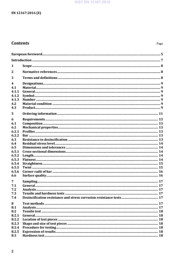Page European foreword . 5 Introduction . 7 1 Scope . 8 2 Normative references . 8 3 Terms and definitions . 8 4 Designations. 9 4.1 Material . 9 4.1.1 General . 9 4.1.2 Symbol . 9 4.1.3 Number . 9 4.2 Material condition . 9 4.3 Product . 9 5 Ordering information . 11 6 Requirements . 13 6.1 Composition . 13 6.2 Mechanical properties . 13 6.2.1 Profiles . 13 6.2.2 Bar . 13 6.3 Resistance to dezincification . 13 6.4 Residual stress level . 14 6.5 Dimensions and tolerances . 14 6.5.1 Cross-sectional dimensions . 14 6.5.2 Length . 14 6.5.3 Flatness . 14 6.5.4 Straightness . 15 6.5.5 Twist . 15 6.5.6 Corner radii of bar . 16 6.6 Surface quality. 16 7 Sampling . 17 7.1 General . 17 7.2 Analysis . 17 7.3 Tensile and hardness tests . 17 7.4 Dezincification resistance and stress corrosion resistance tests . 17 8 Test methods . 17 8.1 Analysis . 17 8.2 Tensile test . 18 8.2.1 General . 18 8.2.2 Location of test pieces . 18 8.2.3 Shape and size of test pieces . 18 8.2.4 Procedure for testing . 18 8.2.5 Expression of results . 18 8.3 Hardness test . 18 SIST EN 12167:2016
