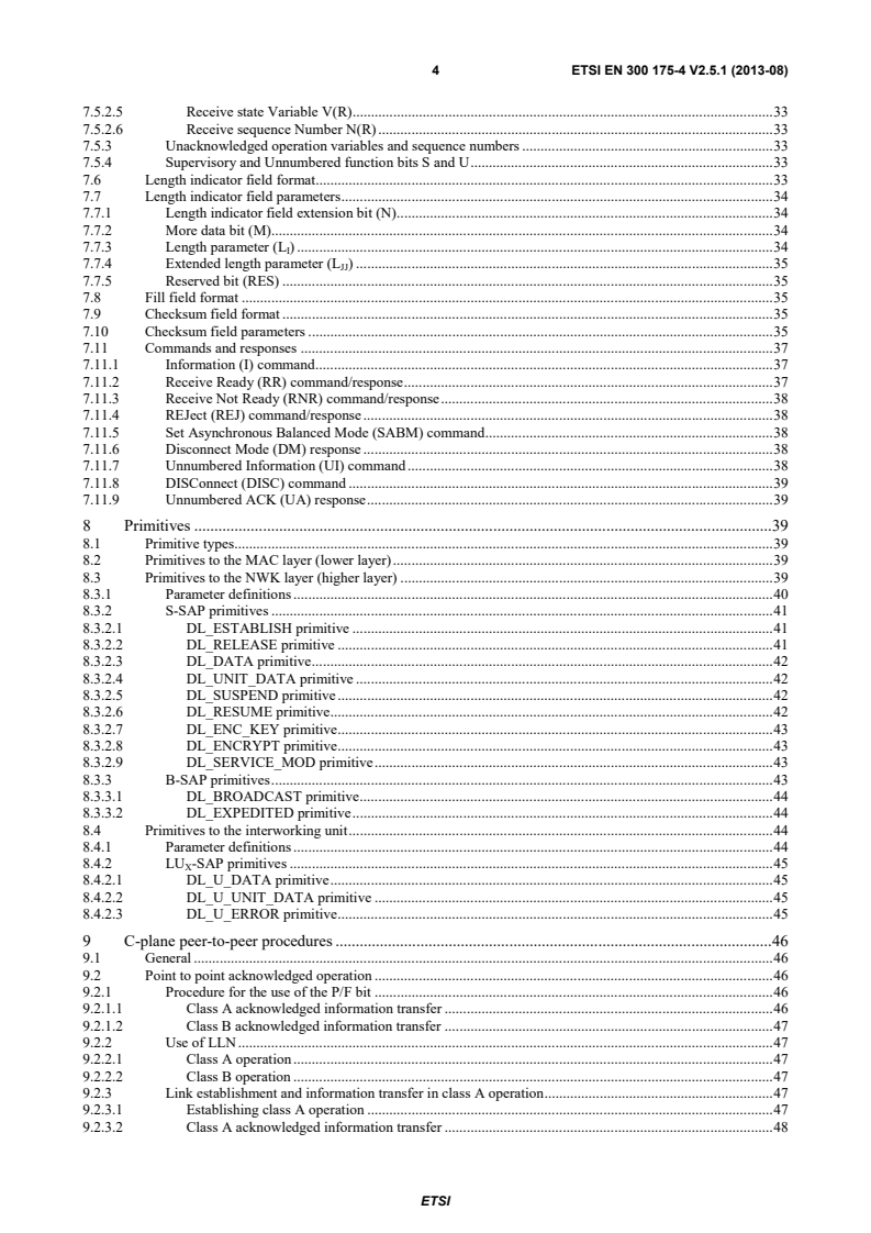 ETSI ETSI EN 300 175-4 V2.5.1 (2013-08) 4 7.5.2.5 Receive state Variable V(R) . 33 7.5.2.6 Receive sequence Number N(R) . 33 7.5.3 Unacknowledged operation variables and sequence numbers . 33 7.5.4 Supervisory and Unnumbered function bits S and U . 33 7.6 Length indicator field format. 33 7.7 Length indicator field parameters . 34 7.7.1 Length indicator field extension bit (N) . 34 7.7.2 More data bit (M) . 34 7.7.3 Length parameter (LI) . 34 7.7.4 Extended length parameter (LJJ) . 35 7.7.5 Reserved bit (RES) . 35 7.8 Fill field format . 35 7.9 Checksum field format . 35 7.10 Checksum field parameters . 35 7.11 Commands and responses . 37 7.11.1 Information (I) command . 37 7.11.2 Receive Ready (RR) command/response . 37 7.11.3 Receive Not Ready (RNR) command/response . 38 7.11.4 REJect (REJ) command/response . 38 7.11.5 Set Asynchronous Balanced Mode (SABM) command . 38 7.11.6 Disconnect Mode (DM) response . 38 7.11.7 Unnumbered Information (UI) command . 38 7.11.8 DISConnect (DISC) command . 39 7.11.9 Unnumbered ACK (UA) response . 39 8 Primitives . 39 8.1 Primitive types . 39 8.2 Primitives to the MAC layer (lower layer) . 39 8.3 Primitives to the NWK layer (higher layer) . 39 8.3.1 Parameter definitions . 40 8.3.2 S-SAP primitives . 41 8.3.2.1 DL_ESTABLISH primitive . 41 8.3.2.2 DL_RELEASE primitive . 41 8.3.2.3 DL_DATA primitive . 42 8.3.2.4 DL_UNIT_DATA primitive . 42 8.3.2.5 DL_SUSPEND primitive . 42 8.3.2.6 DL_RESUME primitive . 42 8.3.2.7 DL_ENC_KEY primitive . 43 8.3.2.8 DL_ENCRYPT primitive . 43 8.3.2.9 DL_SERVICE_MOD primitive . 43 8.3.3 B-SAP primitives . 43 8.3.3.1 DL_BROADCAST primitive . 44 8.3.3.2 DL_EXPEDITED primitive . 44 8.4 Primitives to the interworking unit . 44 8.4.1 Parameter definitions . 44 8.4.2 LUX-SAP primitives . 45 8.4.2.1 DL_U_DATA primitive . 45 8.4.2.2 DL_U_UNIT_DATA primitive . 45 8.4.2.3 DL_U_ERROR primitive . 45 9 C-plane peer-to-peer procedures . 46 9.1 General . 46 9.2 Point to point acknowledged operation . 46 9.2.1 Procedure for the use of the P/F bit . 46 9.2.1.1 Class A acknowledged information transfer . 46 9.2.1.2 Class B acknowledged information transfer . 47 9.2.2 Use of LLN . 47 9.2.2.1 Class A operation . 47 9.2.2.2 Class B operation . 47 9.2.3 Link establishment and information transfer in class A operation . 47 9.2.3.1 Establishing class A operation . 47 9.2.3.2 Class A acknowledged information transfer . 48 SIST EN 300 175-4 V2.5.1:2013