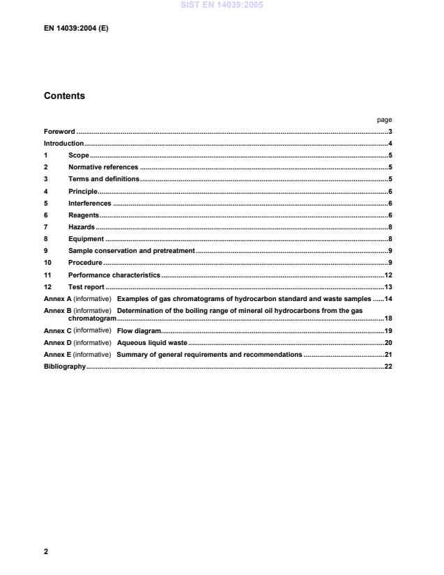 1 Scope This document specifies a method for the quantitative determination of the hydrocarbon content (C10 to C40) in solid waste by gas chromatography. It is applicable to hydrocarbon content between 100 mg/kg and 10 000 mg/kg expressed as dry matter basis. Using this standard all hydrocarbons with a boiling range of approximately 175 °C to 525 °C, e.g. n-alkanes from C10H22 to C40H82, isoalkanes, cycloalkanes, alkyl benzenes, alkyl naphthalenes and polycyclic aromatic compounds are determined as hydrocarbons, provided they do not adsorb on the Florisil column during clean-up. Volatile hydrocarbons cannot be quantitatively determined using this standard. This will affect the determination of some common hydrocarbon fuels, e.g. petrol. NOTE 1 On the basis of the peak pattern of the gas chromatogram (see Annex A) and of the boiling points of the individual n-alkanes listed in Annex B the approximate boiling range of the hydrocarbons and some qualitative information on the nature of the hydrocarbons can be obtained. NOTE 2 At the moment there is no sufficient information on how to handle organic liquid wastes for the analysis of hydrocarbons. NOTE 3 Aqueous liquid waste samples can be analysed in accordance with EN ISO 9377-2 or the procedure specified in Annex E. 2 Normative references The following referenced documents are indispensable for the application of this document. For dated references, only the edition cited applies. For undated references, the latest edition of the referenced document (including any amendments) applies. prEN 14346, Characterization of waste — Calculation of dry matter by determination of dry residue and water content EN ISO 3696, Water for analytical laboratory use - Specification and test methods (ISO 3696:1987) ISO 8466-1, Water quality — Calibration and evaluation of analytical methods and estimation of performance characteristics — Part 1: Statistical evaluation of the linear calibration function 3 Terms and definitions For the purposes of this document, the following terms and definitions apply. 3.1 hydrocarbon content by gas chromatography sum of compounds that are extractable with with acetone/n-heptane (2+1), provided that they do not adsorb on Florisil; they can be chromatographed on a non-polar capillary column with retention times between those of n-decane (C10H22) and n-tetracontane (C40H82) NOTE 1 Substances that comply with this definition are mainly non-polar long chain or branched aliphatic, alicyclic, alkyl substituted aromatic or polycyclic aromatic compounds. NOTE 2 This definition differs from that given in EN 14345. SIST EN 14039:2005