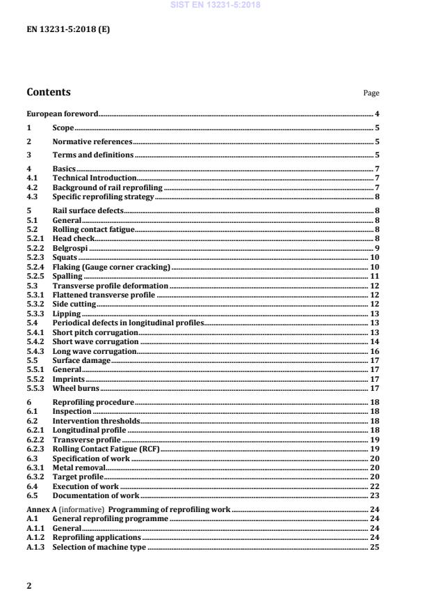 SIST EN 13231-5:2018 is a standard published by the Slovenian Institute for Standardization (SIST). Its full title is "Railway applications - Track - Acceptance of works - Part 5: Procedures for rail reprofiling in plain line, switches, crossings and expansion devices". This standard covers: This document specifies the procedure for planning and execution of rail reprofiling work including description of rail surface defects. It concerns work in both plain lines and switches and crossings generally done with machines according to the EN 14033 series and EN 15746 series. It applies to vignole railway rails of 46 kg/m and above according to EN 13674-1.