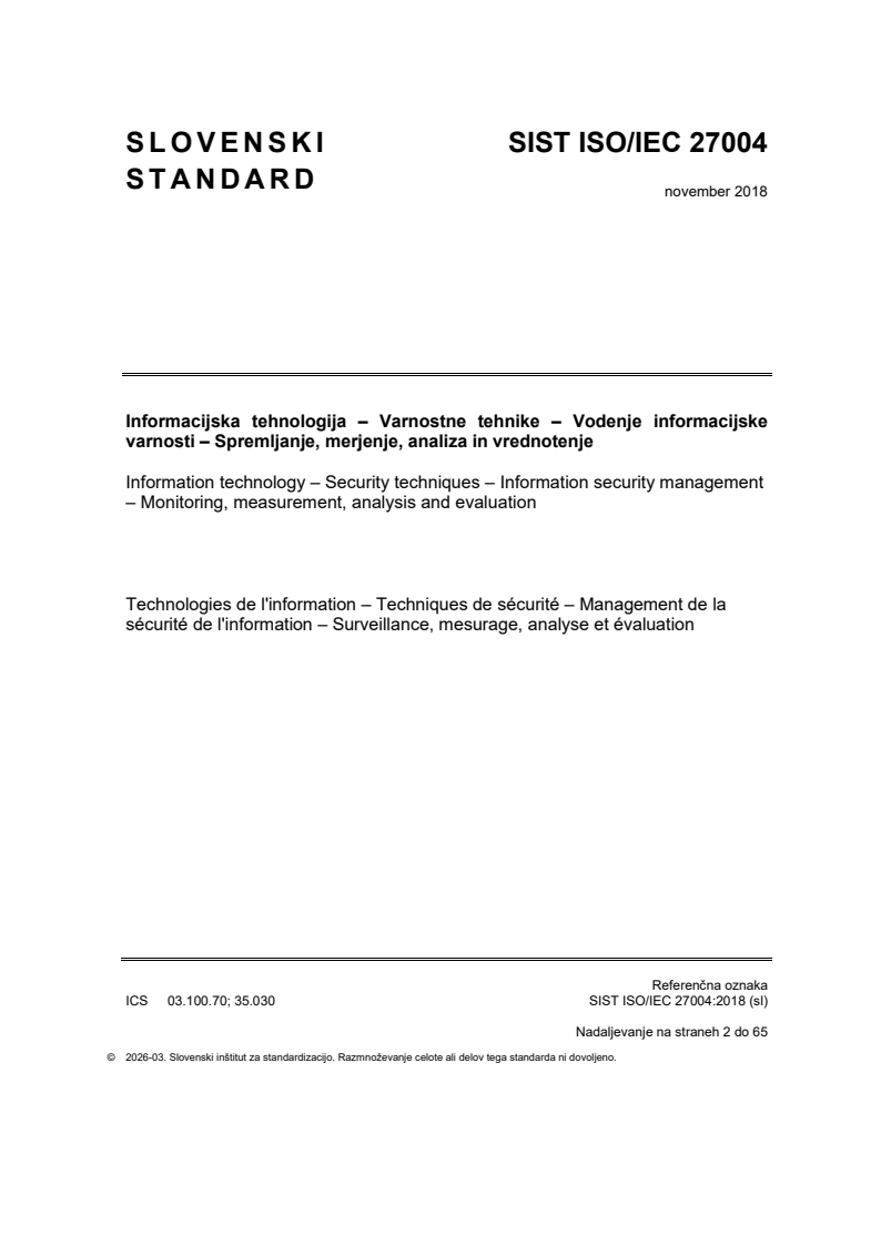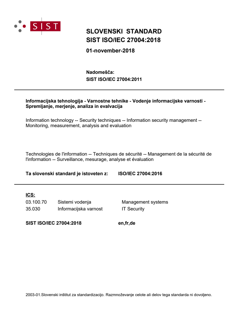 SIST ISO/IEC 27004:2018 is a standard published by the Slovenian Institute for Standardization (SIST). Its full title is "Information technology -- Security techniques -- Information security management -- Monitoring, measurement, analysis and evaluation". This standard covers: ISO/IEC 27004:2016 provides guidelines intended to assist organizations in evaluating the information security performance and the effectiveness of an information security management system in order to fulfil the requirements of ISO/IEC 27001:2013, 9.1. It establishes: a) the monitoring and measurement of information security performance; b) the monitoring and measurement of the effectiveness of an information security management system (ISMS) including its processes and controls; c) the analysis and evaluation of the results of monitoring and measurement. ISO/IEC 27004:2016 is applicable to all types and sizes of organizations.