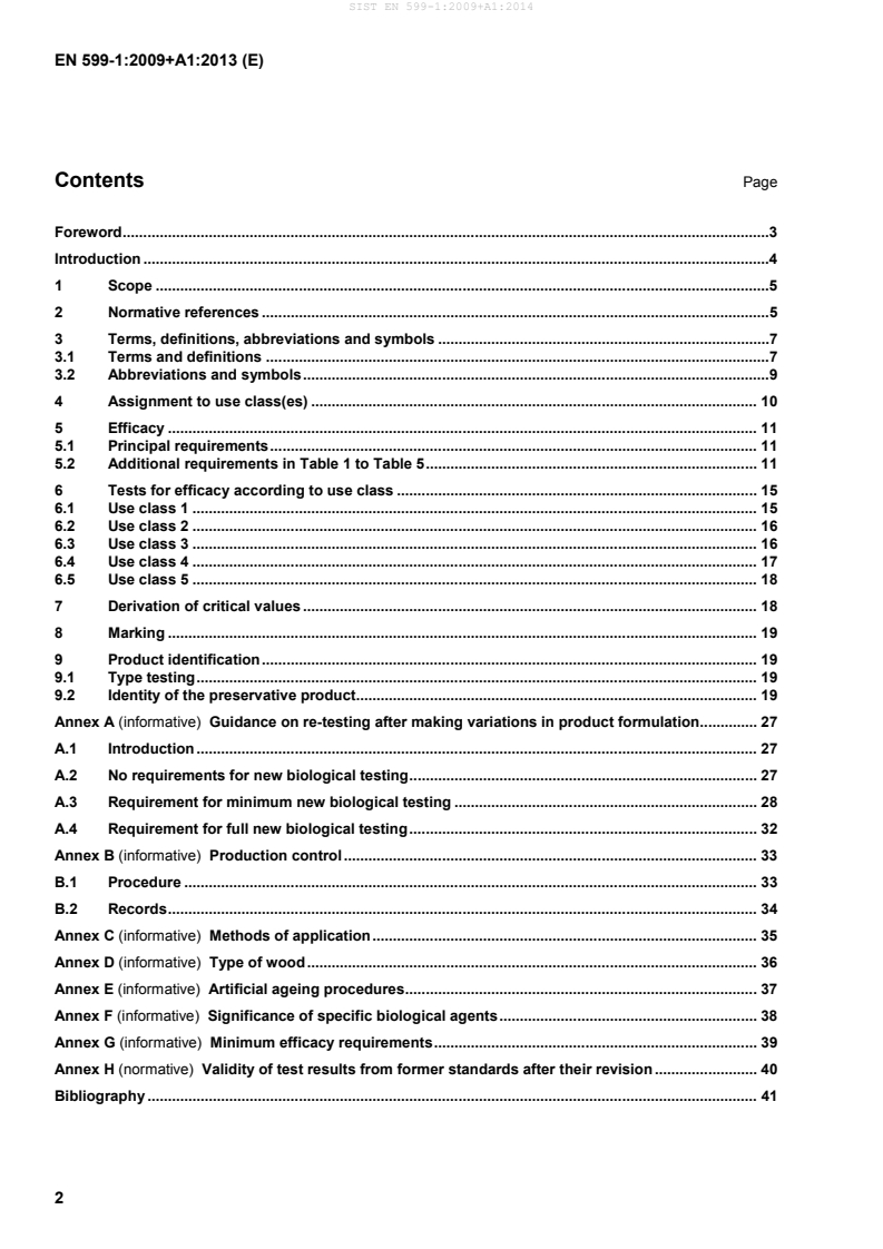 Dieser Teil von EN 599 legt für jede der fünf in EN 335-1 definierten Klassen die erforderlichen biologischen Prüfungen fest, die in Verbindung mit den erforderlichen Mindestalterungsprüfungen für die entsprechende Gebrauchsklasse, zur Bewertung der Wirksamkeit von Holzschutzmitteln zur vorbeugenden Behandlung von Vollholz notwendig sind. Er stellt ein Verfahren zur Berechnung der Mindestmenge eines Schutzmittels zur Verfügung. Die Mindestmenge ist der Wert, der dazu verwendet werden muss, die empfohlene Aufnahme des Schutzmittels für bestimmte Gebrauchsbedingungen zu berechnen. Die Mindestmenge ist nicht not-wendigerweise die empfohlene Aufnahme oder der Mindestaufnahmegrad des Schutzmittels. Das große Spektrum an Gefährdungen, Expositionsbedingungen und die europaweiten Anforderungen an die Gebrauchsdauer erfordern es, dass örtliche Gegebenheiten bei der Berechnung der erforderlichen Schutz-mittelaufnahme berücksichtigt werden; EN 351-1 stellt die Mindestmenge zur Verfügung, die angepasst werden kann, um diese Faktoren zu berücksichtigen.