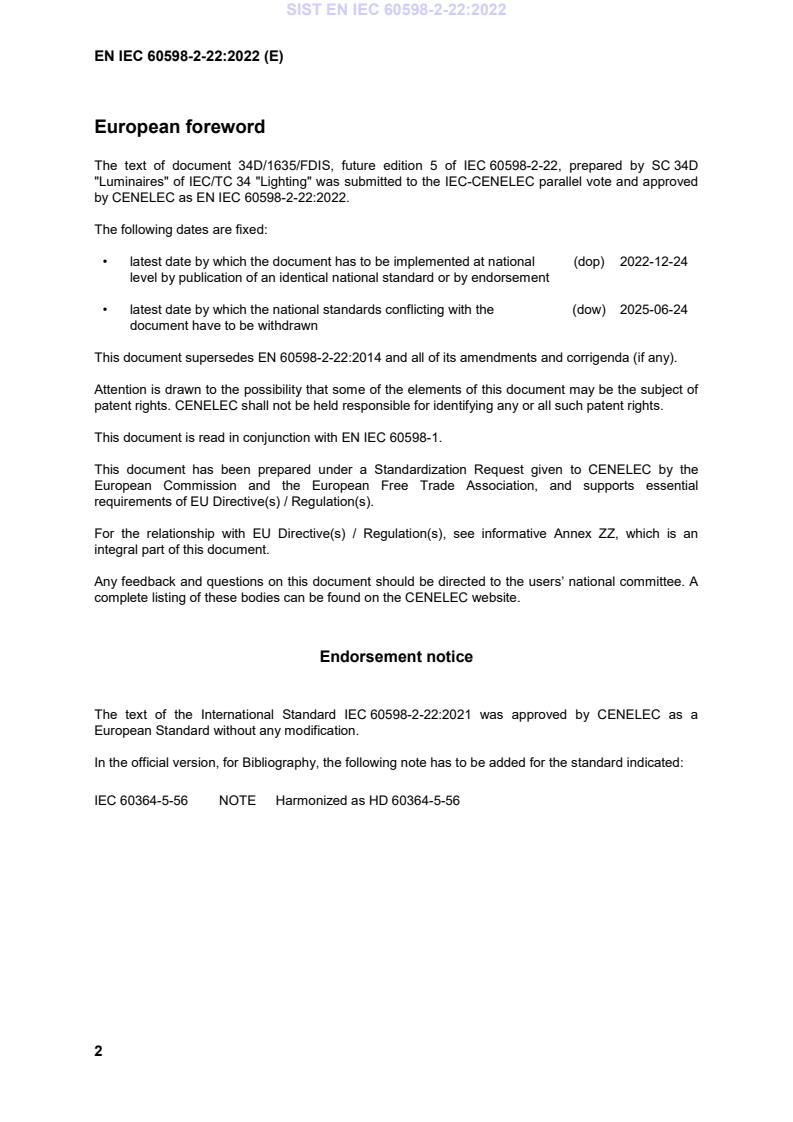 EN IEC 60598-2-22:2022 - "Luminaires - Part 2-22: Particular requirements - Luminaires for emergency lighting" - specifies safety and performance requirements for emergency luminaires intended for use with electrical lamps powered from emergency supplies up to 1 000 V. The standard provides general requirements for emergency lighting equipment, clarifies terminology (the term lamp includes light sources), and is intended to be used together with EN IEC 60598-1 (general luminaire requirements). It does not cover effects of non-emergency voltage reductions on luminaires that incorporate high-pressure discharge lamps.