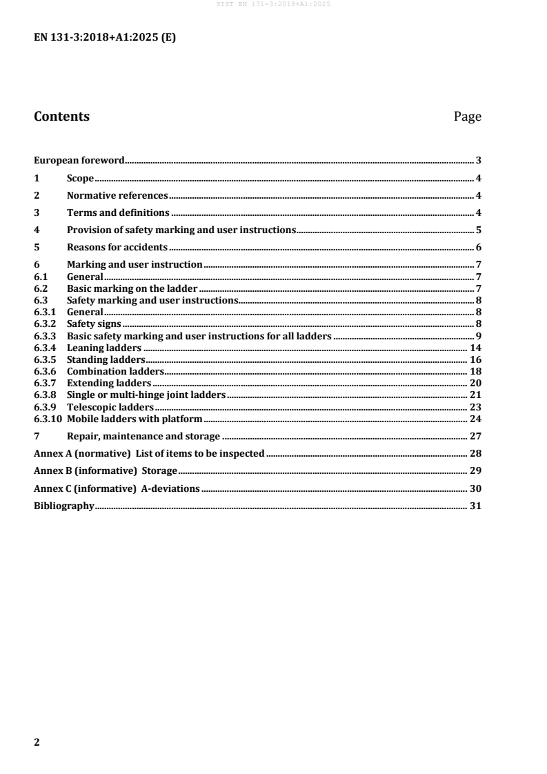 SIST EN 131-3:2018+A1:2025 is a standard published by the Slovenian Institute for Standardization (SIST). Its full title is "Ladders - Part 3: Marking and user instructions". This standard covers: This European Standard advises on the safe use of ladders covered by the scope of EN 131-1 and fulfilling the requirements of EN 131-1, EN 131-2 and, for single or multiple hinged-joint ladders, EN 131-4, for telescopic ladders EN 131-6 and for mobile platform ladders EN 131-7.