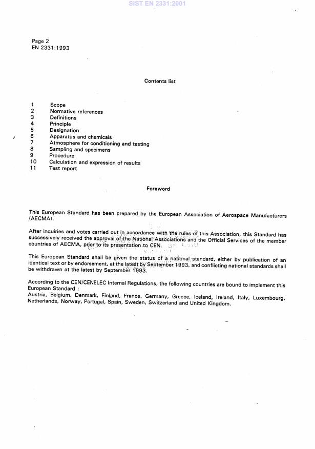 SIST EN 2331:2001 is a standard published by the Slovenian Institute for Standardization (SIST). Its full title is "Aerospace series - Textile glass fibre preimpregnates - Test methods for the determination of the resin and fibre content and mass of fibre per unit area". This standard covers: This standard specifies a method for determining the resin content (with or without volatiles) and fibre content and mass of fibre per unit area of a textile glass fibre preimpregnate by ignition and solvent extraction, for aerospace use.