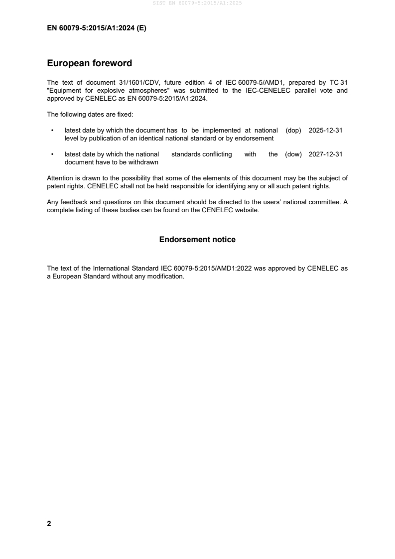 - Normative references and compliance: The amendment endorses IEC 60079‑5 content; users must consult the normative references cited for correct application. National implementation dates and withdrawal timelines are specified.