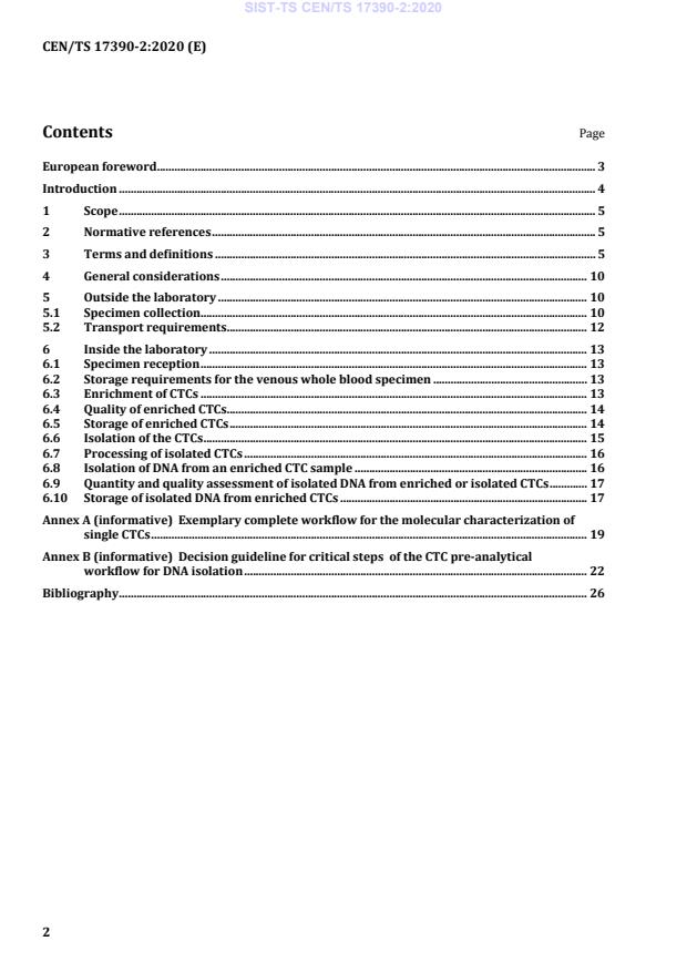 Ta dokument podaja smernice glede obravnave, shranjevanja, obdelave in dokumentiranja vzorcev venske krvi, namenjenih za analizo človeške genomske DNK, izolirane iz cirkulirajočih tumorskih celic (CTC) med predpreiskovalno fazo, preden se izvede molekularna preiskava. Ta dokument se uporablja za molekularne diagnostične preiskave in vitro, vključno z laboratorijsko razvitimi preskusi, ki jih izvajajo v medicinskih laboratorijih. Namenjen je tudi temu, da ga uporabljajo laboratorijske stranke, razvijalci in proizvajalci diagnostike in vitro, biobanke, institucije in komercialne organizacije, ki izvajajo biomedicinske raziskave, ter regulativni organi. Ta dokument ne zajema izolacije določenih krvnih celic in nadaljnje izolacije genomske DNK iz njih. DNK v patogenih v krvi ni zajeta v tem dokumentu.