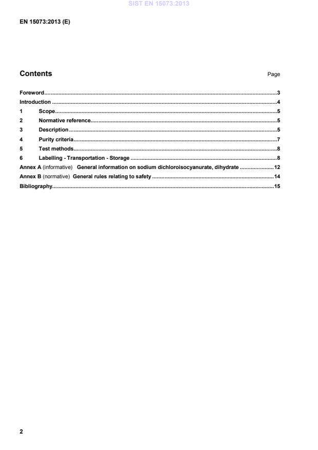 5 1 Scope This European Standard is applicable to sodium dichloroisocyanurate, dihydrate used directly or used to prepare commercial formulations for disinfecting swimming pool water. It describes the characteristics of sodium dichloroisocyanurate, dehydrate and specifies the requirements and the corresponding test methods for sodium dichloroisocyanurate, dihydrate. It gives information on its use for treating swimming pool water. It also determines the rules relating to safe handling and use (see Annex B). 2 Normative reference The following documents, in whole or in part, are normatively referenced in this document and are indispensable for its application. For dated references, only the edition cited applies. For undated references, the latest edition of the referenced document (including any amendments) applies. EN 12932:2008, Chemicals used for treatment of water intended for human consumption — Chemicals for emergency use — Sodium dichloroisocyanurate, dihydrate 3 Description 3.1 Identification 3.1.1 Chemical name 1-sodium, 3, 5-dichloro-1,3,5-triazine-2, 4, 6-trione dihydrate. 3.1.2 Synonym or common name Sodium dichloroisocyanurate, dihydrate. Troclosene sodium, dihydrate 3.1.3 Relative molecular mass 256,02. 3.1.4 Empirical formula C3N3O3Cl2Na.2H2O. SIST EN 15073:2013