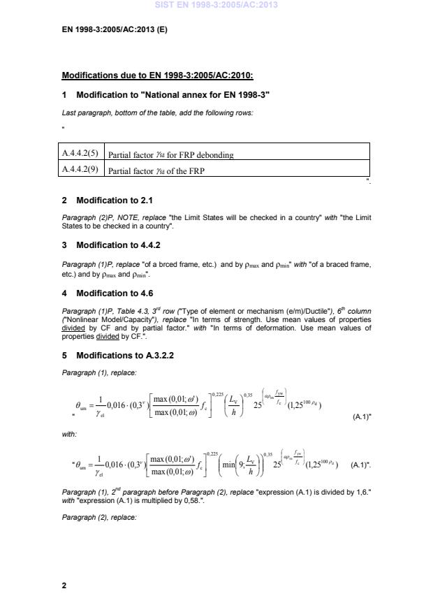 and by max and min" with "of a braced frame, etc.) and by max and min". 4 Modification to 4.6 Paragraph (1)P, Table 4.3, 3rd row ("Type of element or mechanism (e/m)/Ductile"), 6th column ("Nonlinear Model/Capacity"), replace "In terms of strength. Use mean values of properties divided by CF and by partial factor." with "In terms of deformation. Use mean values of properties divided by CF.". 5 Modifications to A.3.2.2 Paragraph (1), replace: ")25,1(25);01,0(max)';01,0(max)3,0(016,01dcywsx10035,0V225,0celumραρνωωγθ⋅=ffhLf (A.1)" with: ")25,1(25;9min);01,0(max)';01,0(max)3,0(016,01dcywsx10035,0V225,0celumραρνωωγθ⋅=ffhLf (A.1)". Paragraph (1), 2nd paragraph before Paragraph (2), replace "expression (A.1) is divided by 1,6." with "expression (A.1) is multiplied by 0,58.". Paragraph (2), replace: SIST EN 1998-3:2005/AC:2013