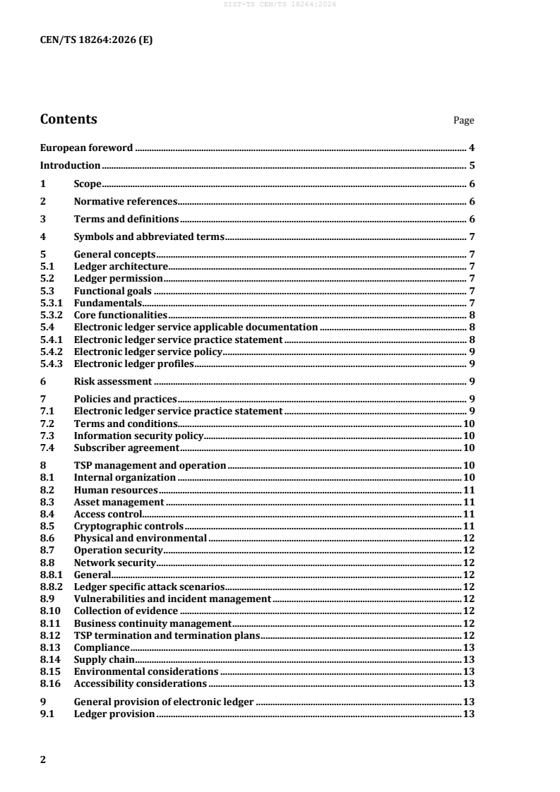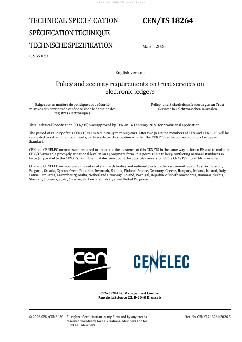 SIST-TS CEN/TS 18264:2026 specifies the policy, functional, and security requirements for trust services on electronic ledgers. This European Technical Specification supports the implementation of the amended eIDAS Regulation (EU) 2024/1183, enabling secure and trustworthy electronic ledger services for digital transactions across Europe. By defining a framework for trust service providers (TSPs), the standard ensures the integrity, authenticity, and chronological order of data recorded on electronic ledgers, whether centralized or distributed, and clarifies the roles, responsibilities, and technical measures needed to deliver compliant trust services.
