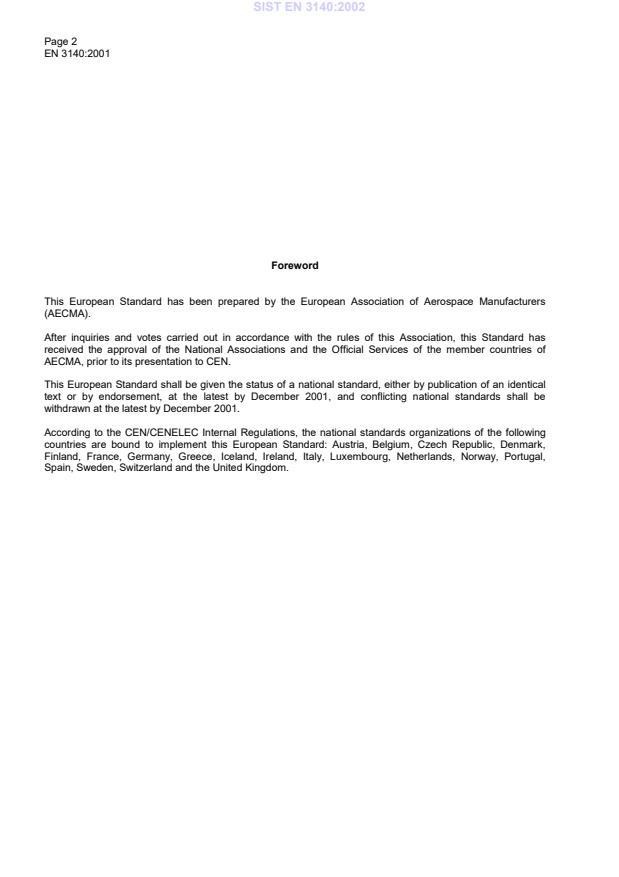 Page 2EN 3140:2001ForewordThis European Standard has been prepared by the European Association of Aerospace Manufacturers(AECMA).After inquiries and votes carried out in accordance with the rules of this Association, this Standard hasreceived the approval of the National Associations and the Official Services of the member countries ofAECMA, prior to its presentation to CEN.This European Standard shall be given the status of a national standard, either by publication of an identicaltext or by endorsement, at the latest by December 2001, and conflicting national standards shall bewithdrawn at the latest by December 2001.According to the CEN/CENELEC Internal Regulations, the national standards organizations of the followingcountries are bound to implement this European Standard: Austria, Belgium, Czech Republic, Denmark,Finland, France, Germany, Greece, Iceland, Ireland, Italy, Luxembourg, Netherlands, Norway, Portugal,Spain, Sweden, Switzerland and the United Kingdom.SIST EN 3140:2002