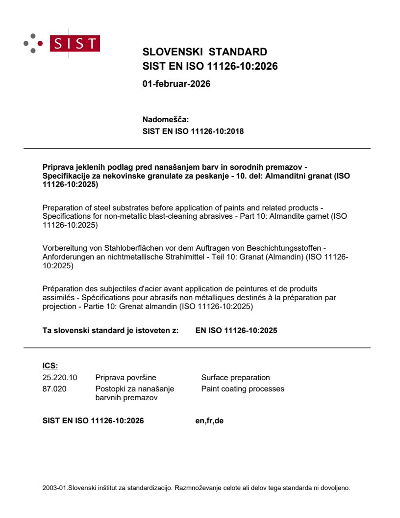 SIST EN ISO 11126-10:2026 is a standard published by the Slovenian Institute for Standardization (SIST). Its full title is "Preparation of steel substrates before application of paints and related products - Specifications for non-metallic blast-cleaning abrasives - Part 10: Almandite garnet (ISO 11126-10:2025)". This standard covers: This document specifies requirements for almandite garnet abrasives, as supplied for blast-cleaning. It specifies ranges of particle sizes and values for apparent density, Mohs hardness, moisture content, conductivity of aqueous extract and water-soluble chlorides. The requirements specified in this document apply to abrasives supplied in the new condition only. They do not apply to abrasives either during or after use. Test methods for non-metallic blast-cleaning abrasives are given in the various parts of the ISO 11127 series. NOTE Although this document has been developed specifically to meet requirements for preparation of steelwork, the properties specified are generally appropriate for use when preparing other material surfaces, or components, using blast- cleaning techniques. These techniques are described in ISO 8504-2.[1]
