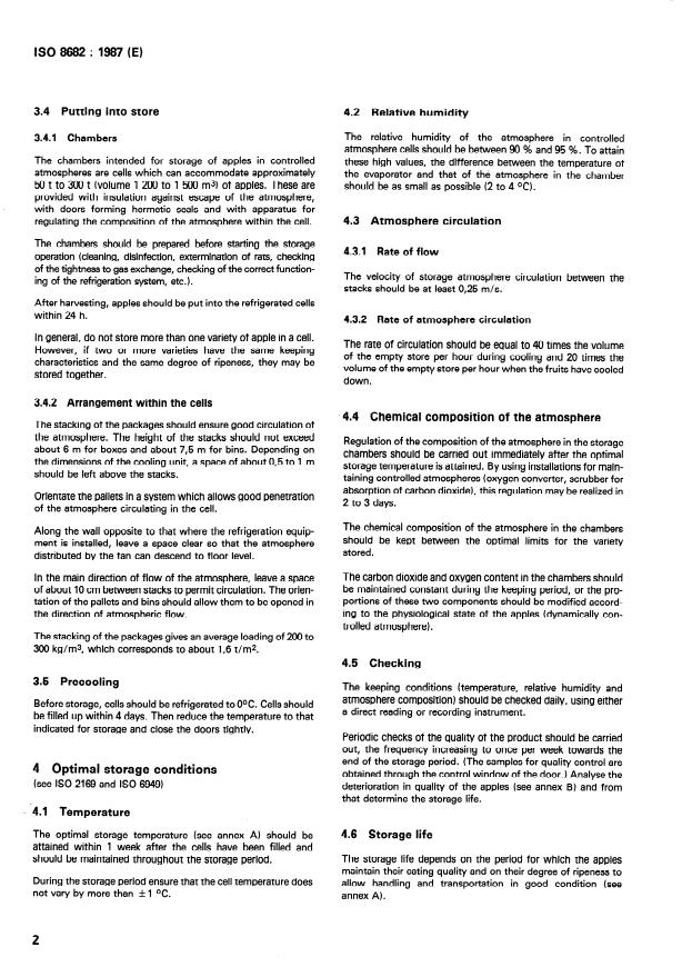 SIST ISO 8682:1996 is a standard published by the Slovenian Institute for Standardization (SIST). Its full title is "Apples -- Storage in controlled atmospheres". This standard covers: The guidance provides conditionds of harvesting and putting into store, and it specifies optimal storageconditions, as temperature, relative humidity, atmosphere circulation, chemical composition of the atmosphere, checking and storage life. An annex A describes optimal conditions for 15 principal varieties. An annex B shows defects arising during storage.