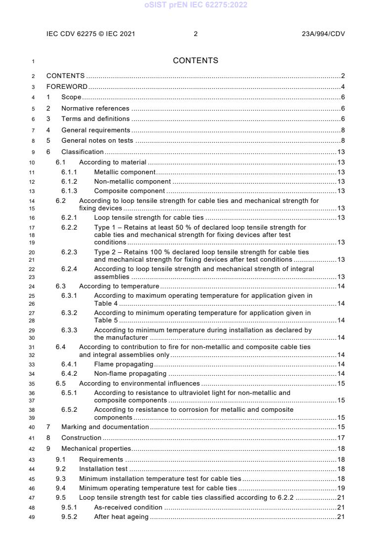 kSIST FprEN IEC 62275:2022 is a draft published by the Slovenian Institute for Standardization (SIST). Its full title is "Cable management systems - Cable ties for electrical installations". This standard covers: IEC 62275:2022 specifies requirements for metallic, non-metallic and composite cable ties and their associated fixing devices as a means used for managing or securing the wiring systems in electrical installations. Cable ties and associated fixing devices can also be suitable for other applications, such as support of wiring systems, and where so used, additional requirements can apply. This fourth edition cancels and replaces the third edition published in 2018. This edition constitutes a technical revision. This edition includes the following significant technical changes with respect to the previous edition: - scope clarification, - new definitions, - deletion of the exception for the stabilization of the moisture content, - possibility to carry out tensile strength tests with dead weights, - differentiation of rubber and acrylic adhesive fixings, - clarification for mechanical testing of integral devices, - clarifications on Table 6, - clarifications in 9.1, - the minimum installation temperature test for cable ties is carried out only when the declared minimum temperature is lower than 0 °C, - a requirement that metallic cable ties be classified according to 6.2.3, - definition of colours to be tested for contribution to fire, - addition of a "some countries" note in Clause 10, - clarification of the mounting of fixing devices in the resistance to ultraviolet light test, - clarification on the testing of integral devices in the resistance to ultraviolet light test.