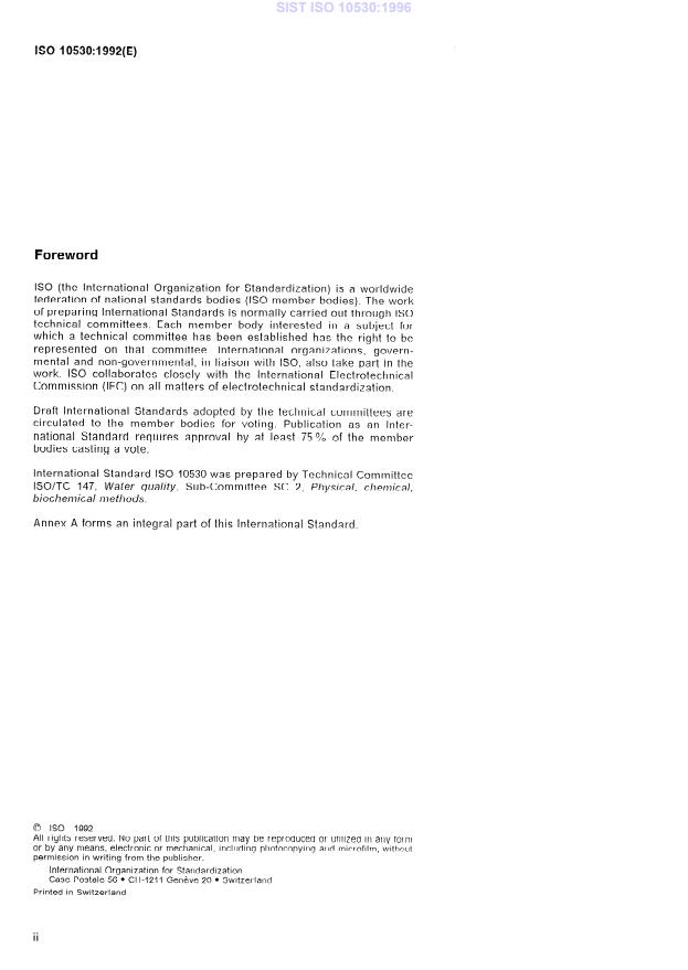 SIST ISO 10530:1996 is classified under the following ICS (International Classification for Standards) categories: 13.060.50 - Examination of water for chemical substances. The ICS classification helps identify the subject area and facilitates finding related standards.