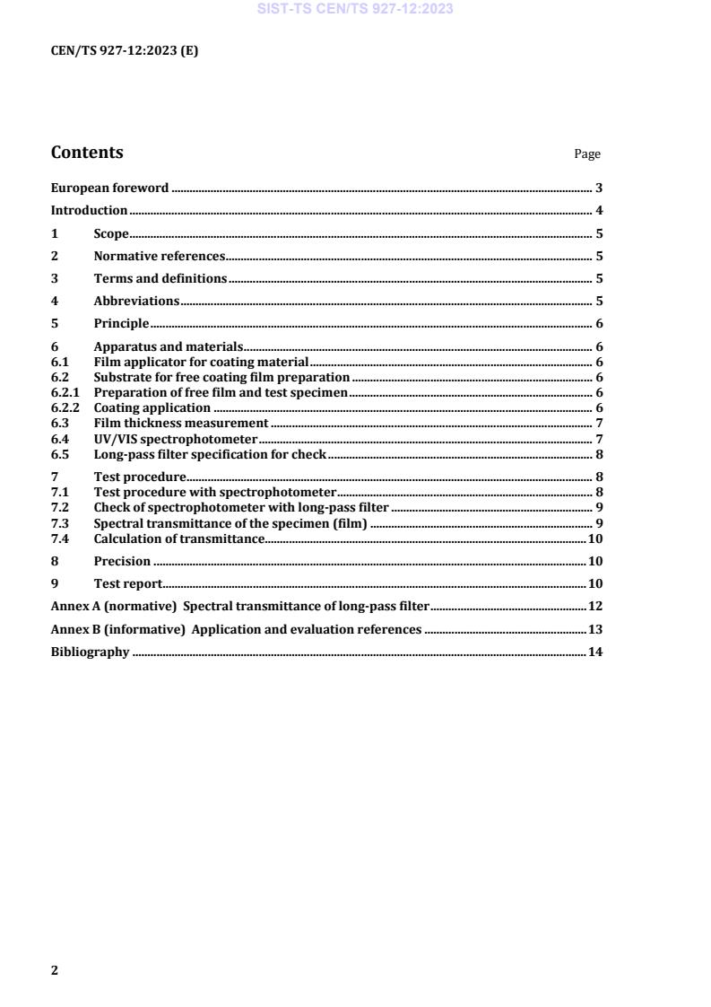 Keywords: CEN/TS 927-12:2023, UV transmittance, visible radiation transmittance, spectral transmittance, exterior wood coatings, UV/VIS spectrophotometer, integrating sphere, long‑pass filter, film thickness, paints and varnishes.