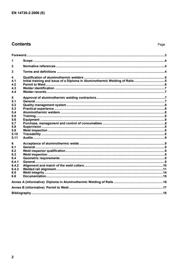 Page Foreword.3 1 Scope.4 2 Normative references.4 3 Terms and definitions.4 4 Qualification of aluminothermic welders.5 4.1 Initial training and issue of a Diploma in Aluminothermic Welding of Rails.5 4.2 Permit to Weld.6 4.3 Welder identification.7 4.4 Welder records.7 5 Approval of aluminothermic welding contractors.7 5.1 General.7 5.2 Quality management system.8 5.3 Practical experience.8 5.4 Aluminothermic welders.8 5.5 Training.8 5.6 Equipment.8 5.7 Purchase, management and control of consumables.8 5.8 Supervision.8 5.9 Weld inspection.8 5.10 Traceability.8 5.11 Audits.9 6 Acceptance of aluminothermic welds.9 6.1 General.9 6.2 Weld inspector qualification.9 6.3 Weld inspection.9 6.4 Geometric requirements.9 6.4.1 General.9 6.4.2 Alignment and match of the weld collars.10 6.4.3 Welded rail alignment.11 6.5 Weld integrity.14 6.6 Documentation.15 Annex A (informative)