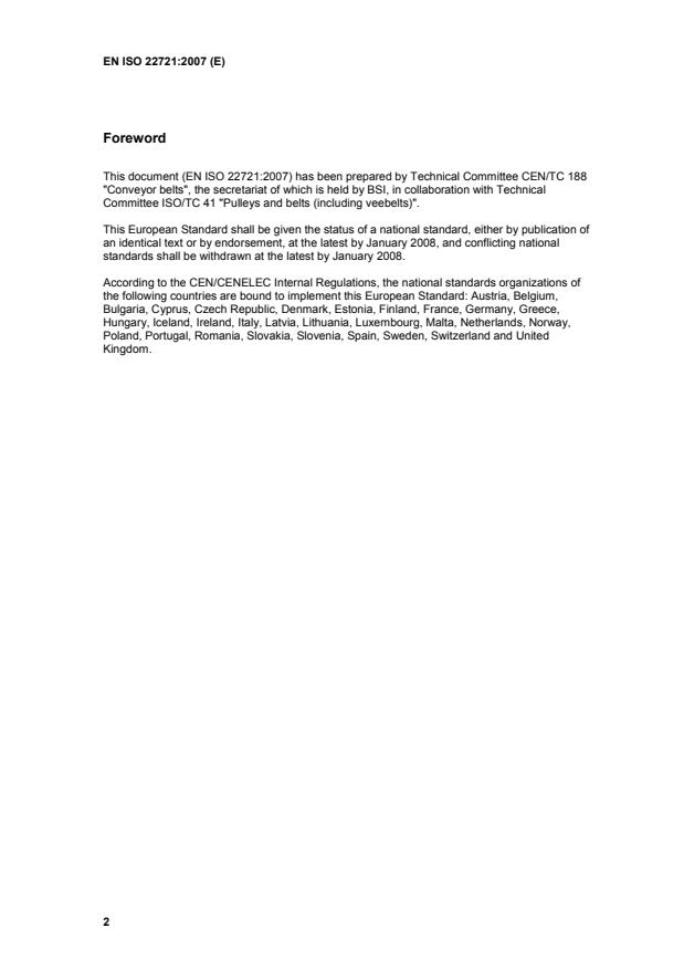SIST EN ISO 22721:2008 is a standard published by the Slovenian Institute for Standardization (SIST). Its full title is "Conveyor belts - Specification for rubber- or plastics-covered conveyor belts of textile construction for underground mining (ISO 22721:2007)". This standard covers: ISO 22721:2007 specifies requirements for rubber- or plastics-covered conveyor belting of textile construction for underground mining on flat or troughed idlers. It is not applicable to light conveyor belts as described in ISO 21183‑1. ISO 22721:2007 does not include requirements for plastics covers.