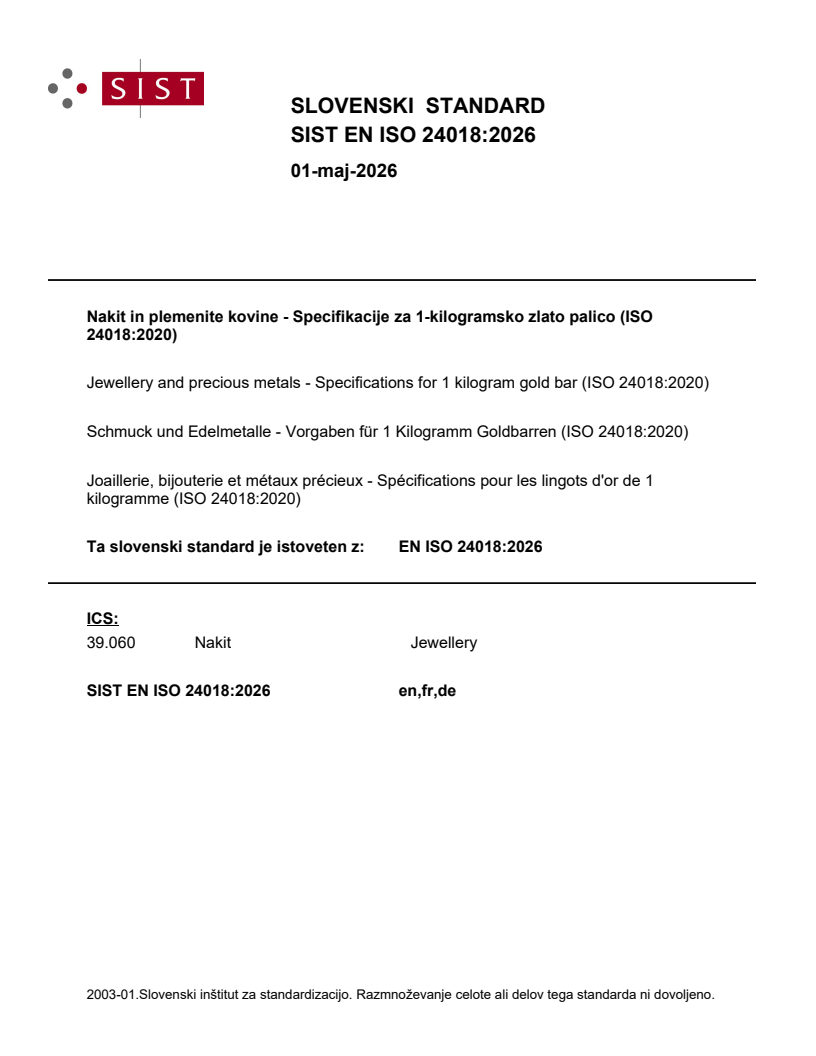 SIST EN ISO 24018:2026 is a standard published by the Slovenian Institute for Standardization (SIST). Its full title is "Jewellery and precious metals - Specifications for 1 kilogram gold bar (ISO 24018:2020)". This standard covers: This document specifies the requirements, test methods, inspection, marking, packaging, transportation, storage, quality certificate and the order (or contract) information of one kilogram gold bars. This document is applicable to one-kilogram cast gold bars produced for investment markets or industrial (jewellery, electronic) markets.