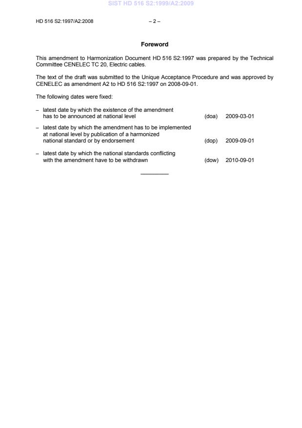 This amendment A2 modifies the Harmonization Document HD 516 S2:1997; it was approved by CENELEC