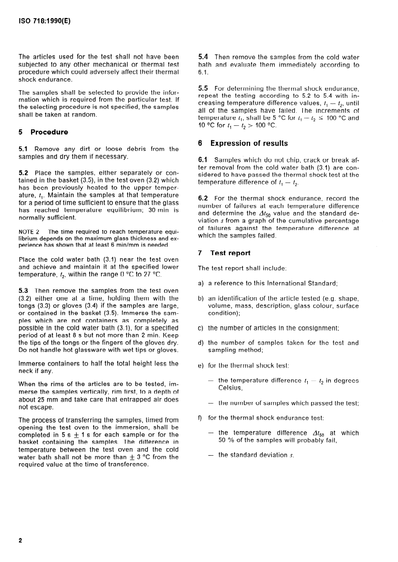 ISO 718:1990 specifies standardized test methods for thermal shock and thermal shock endurance of laboratory glassware in the condition received by the customer. The standard defines how to perform a controlled thermal shock test - heating glassware to an upper temperature and rapidly immersing it in a cold water bath - and how to determine the temperature-difference at which 50% of samples fail (thermal shock endurance). It does not apply to fused silica ware or annealed soda‑lime‑silicate containers (those are covered by ISO 7459).