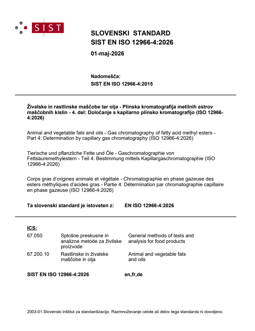 SIST EN ISO 12966-4:2026 is a standard published by the Slovenian Institute for Standardization (SIST). Its full title is "Animal and vegetable fats and oils - Gas chromatography of fatty acid methyl esters - Part 4: Determination by capillary gas chromatography (ISO 12966-4:2026)". This standard covers: This document specifies a method for the determination of fatty acid methyl esters (FAMEs) derived by transesterification or esterification from fats, oils, and fatty acids by capillary gas chromatography (GLC). FAMEs from C4 to C24 can be separated using this document including saturated FAMEs, cis- and trans-monounsaturated FAMEs, and cis- and trans-polyunsaturated FAMEs. This document is applicable to crude, refined, partially hydrogenated or fully hydrogenated fats, oils and fatty acids derived from animal and vegetable sources, and fats extracted from foodstuff. This document does not apply to milk and milk products (or fat coming from milk and milk products) or products supplemented with conjugated linoleic acid (CLA). This document does not apply to di-, tri-, polymerized, hydroxylated and oxidized fatty acids, and fats and oils. A method for the determination of the composition of FAMEs expressed by area % in liquid vegetable oils is proposed in Annex E.