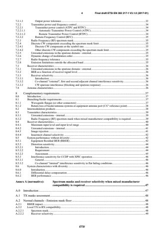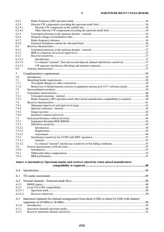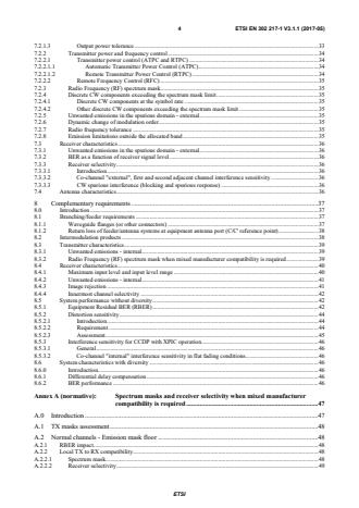 ETSI ETSI EN 302 217-1 V3.1.1 (2017-05) 5 A.3 Innermost channels for channel arrangements from about 4 GHz to about 8,5 GHz with channel separation of 28 MHz to 30 MHz . 49 A.3.0 Introduction . 49 A.3.1 Innermost channels spectrum masks . 49 A.3.2 Receiver innermost channel selectivity . 51 A.4 Innermost channels for channel arrangements from about 4 GHz to 11 GHz with channel separation of 40 MHz . 52 A.4.0 Introduction . 52 A.4.1 Innermost channels spectrum masks . 52 A.4.2 Receiver innermost channels selectivity . 53 A.5 Innermost channels for 18 GHz channel arrangements with channel separation of 55 MHz . 54 A.5.0 Introduction . 54 A.5.1 Innermost channels spectrum masks . 54 A.5.2 Receiver innermost channels selectivity . 55 Annex B (normative): Definition of equivalent data rates for packet data, PDH/SDH and other signals on the traffic interface. 57 Annex C (informative): Information on Multi-channel and Channel-aggregation differences and operation . 58 Annex D (informative): Additional information on relevant characteristics and operation . 60 D.1 Residual Bit Error Ratio (RBER) and Residual Frame Error Ratio (RFER) . 60 D.2 Measurement test set for XPI characteristics . 61 D.3 Differential delay compensation range . 62 D.4 FER/BER equivalence and FER performance measurement equipment settings (example) . 63 D.4.1 FER/BER equivalence . 63 D.4.2 FER equipment settings and measurement techniques (example) . 64 D.5 Impact of power control (ATPC and/or RTPC), mixed-mode and bandwidth adaptive operation on spectrum mask and link design requirements . 64 D.5.0 Introduction . 64 D.5.1 ATPC and RTPC . 64 D.5.1.1 ATPC . 64 D.5.1.2 ATPC and RTPC implementation background . 65 D.5.2 Mixed−mode and bandwidth adaptive operation impact . 67 D.5.2.1 Mixed−mode basic concepts . 67 D.5.2.2 Bandwidth adaptive . 68 D.5.2.2.1 Basic concepts . 68 D.5.2.2.2 Bandwidth (channel) occupancy . 68 D.5.3 Impact on frequency co ordination . 68 D.5.4 Impact of operating conditions on "essential" parameters in article 3.2 of Directive 2014/53/EU . 68 D.6 Typical interference sensitivity behaviour for frequency planning purpose . 69 Annex E (informative): Mechanical characteristics . 70 Annex F (informative): Mitigation techniques referred in ERC/DEC(00)07 (18 GHz band) . 71 Annex G (informative): Change history . 72 History . 73