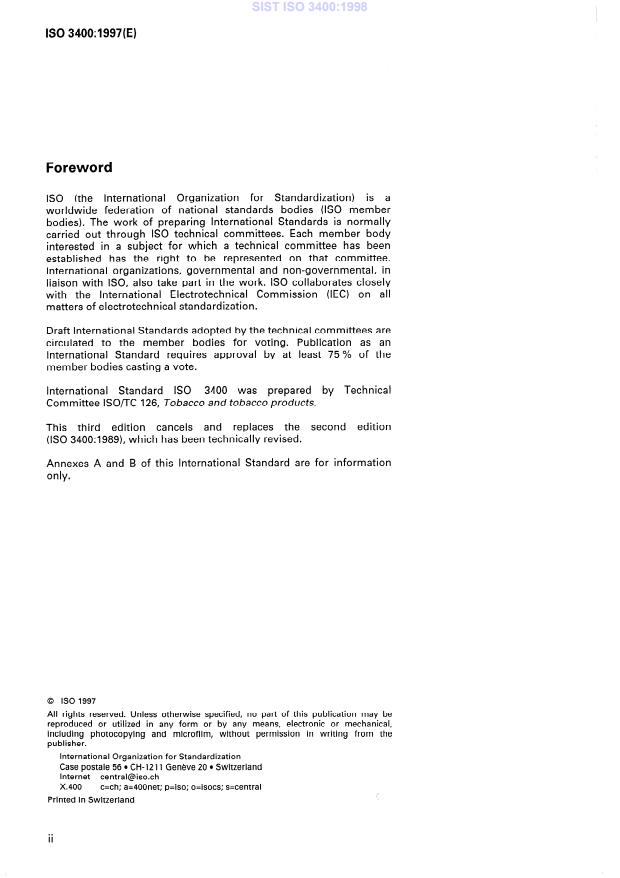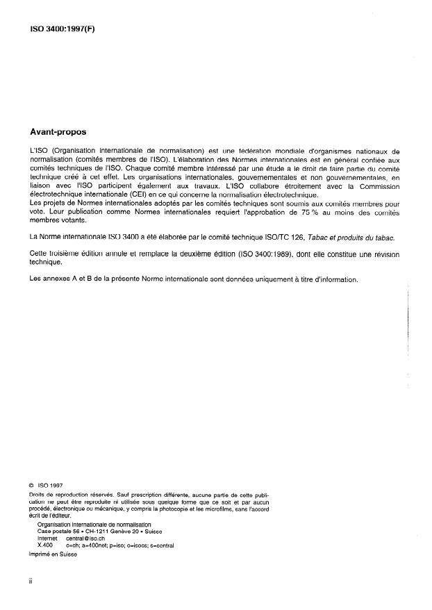 La Norme internationale ISO 3400 a été élaborée par le comité technique ISOIK 126, Tabac et produits du tabac.