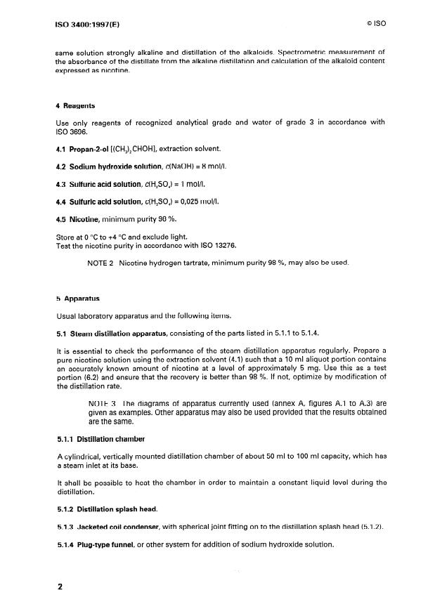 - Reagents and materials: analytical grade reagents and ISO 3696 grade water; propan‑2‑ol, NaOH (8 mol/L), H2SO4 (1 mol/L and 0.025 mol/L), and nicotine standard (≥98 % purity).