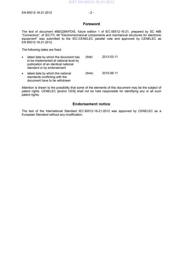 Attention is drawn to the possibility that some of the elements of this document may be the subject of patent rights. CENELEC [and/or CEN] shall not be held responsible for identifying any or all such patent rights. Endorsement notice The text of the International Standard IEC 60512-16-21:2012 was approved by CENELEC as a European Standard without any modification.