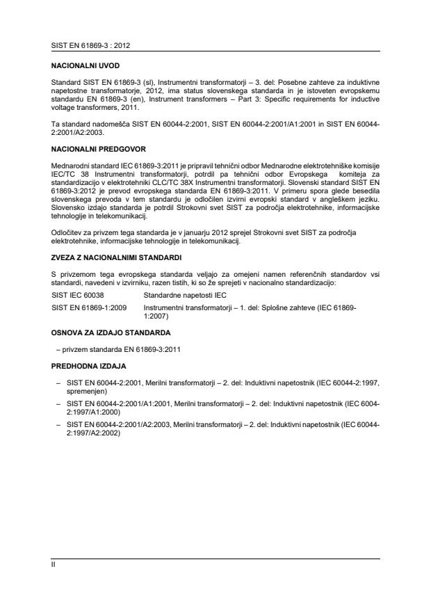 SIST EN 61869-3:2012 is a standard published by the Slovenian Institute for Standardization (SIST). Its full title is "Instrument transformers - Part 3: Specific requirements for inductive voltage transformers". This standard covers: This part of IEC 61869 applies to new inductive voltage transformers for use with electrical measuring instruments and electrical protective devices at frequencies from 15 Hz to 100 Hz. NOTE 301 Requirements specific to three-phase voltage transformers are not included in this standard but, so far as they are relevant, the requirements in clauses 4 to 10 apply to these transformers and a few references to them are included in those clauses (e.g. see 3.1.303, 5.301.1, 5.301.2, 5.5.301, 6.13.301.1 and Table 304). All the transformers shall be suitable for measuring purposes, but, in addition, certain types may be suitable for protection purposes. Transformers for the dual purpose of measurement and protection shall comply with all clauses of this standard.