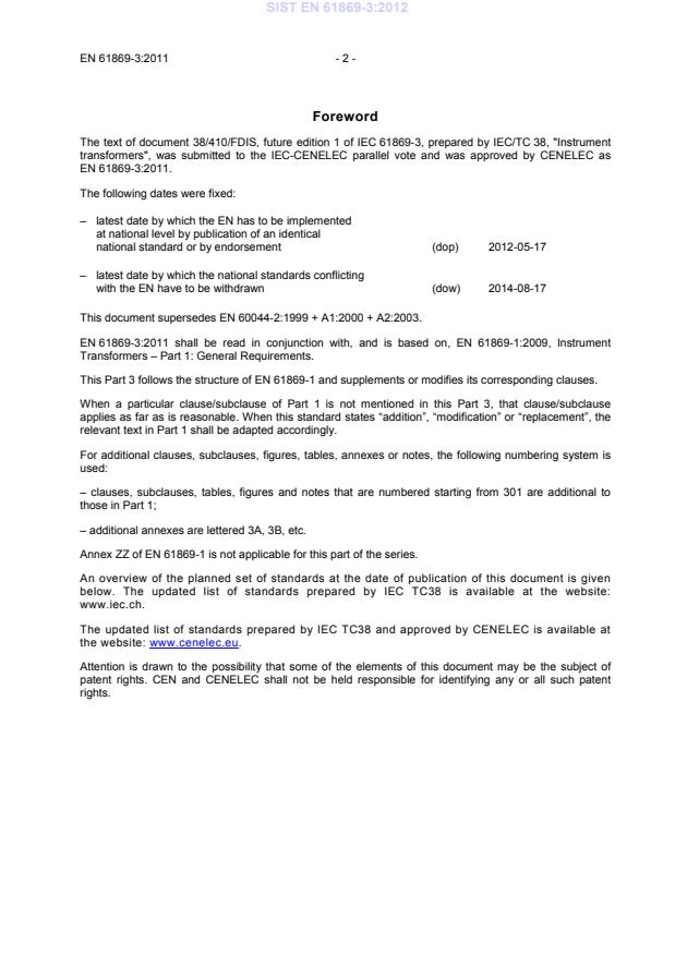SIST EN 61869-3:2012 has the following relationships with other standards: It is inter standard links to SIST EN 60044-2:2001, SIST EN 60044-2:2001/A1:2001, SIST EN 60044-2:2001/A2:2003, SIST EN 60044-2:2001/A2:2003, SIST EN 60044-2:2001/A1:2001, SIST EN 60044-2:2001. Understanding these relationships helps ensure you are using the most current and applicable version of the standard.