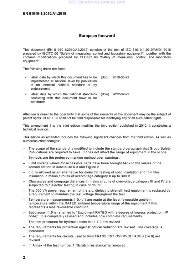 EN 61010-1:2010/A1:2019 is the CENELEC (CLC) amendment to the IEC safety standard for electrical equipment for measurement, control and laboratory use - Part 1: General requirements. This edition incorporates the March 2019 corrigendum and the technical changes of AMD1 (IEC 61010-1:2010/AMD1:2016, modified). It is a harmonized European standard intended to help manufacturers and conformity assessors meet the safety objectives of the Low Voltage Directive (2014/35/EU).