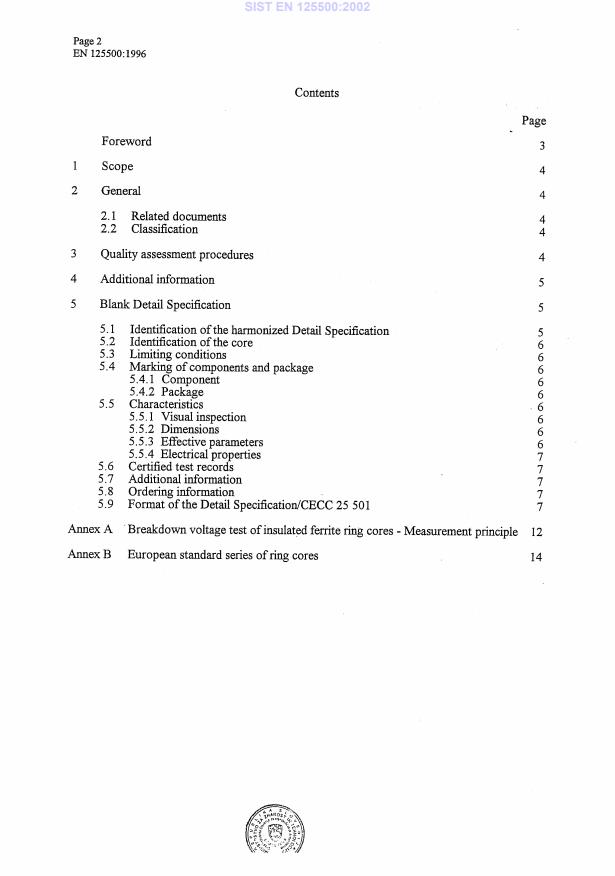 SIST EN 125500:2002 is a standard published by the Slovenian Institute for Standardization (SIST). Its full title is "Sectional Specification: Magnetic oxide ring cores for interference suppression and low level signal transformer applications". This standard covers: This Sectional Specification prescribes the characteristics, ratings and inspection requirements of assessed quality for ring cores made of soft magnetic oxides and iron powders. Such cores are intended for chokes for interference suppression and also for low level signam transformers for professional and industrial applications (see note below). In order to increase winding ease and to improve voltage breakdown, the cores are often provded with protective coatings. In annex A methods for testing voltage breakdown are given; in annex B a standard series of ring cores is listed. NOTE: Ring cores used for power application are covered by CECC 25 300. Ring cores used for other applications (e.g. pulse, memory storage) are not considered here. It selects from the Generic Specification CECC 25 000, the appropriate methods of test to be used in Detail Specifications derived from this specification, and contans the test schedules to be used in the preparation of such specifications. Each test schedule, referenced by a CECC number, when taken with the appropriate information in clause 5 of this specification, forms a Blank Detail Specification.