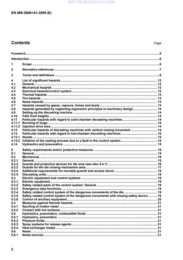(ISO 13850:2006)" !EN ISO 13857:2008, Safety of machinery — Safety distances to prevent hazard zones being reached by upper and lower limbs (ISO 13857:2008)" EN ISO 14122-1, Safety of machinery — Permanent means of access to machinery — Part 1: Choice of a fixed means of access between two levels (ISO 14122-1:2001) EN ISO 14122-2, Safety of machinery — Permanent means of access to machinery — Part 2: Working platforms and walkways (ISO 14122-2:2001) EN ISO 14122-3, Safety of machinery — Permanent means of access to machinery — Part 3: Stairs, stepladders and guard-rails (ISO 14122-3:2001) !ISO 3864-1, Graphical symbols — Safety colours and safety signs — Part 1: Design principles for safety signs in workplaces and public areas" ISO 7000, Graphical symbols for use on equipment — Index and synopsis 3 Terms and definitions For the purposes of this document, the terms and definitions given in EN ISO 12100-1:2003 and the following apply. NOTE Definitions used in EN and ISO standards referred to in this document are also valid for this document. 3.1 casting to cast a component/product by the use of pressure diecasting SIST EN 869:2007+A1:2009
