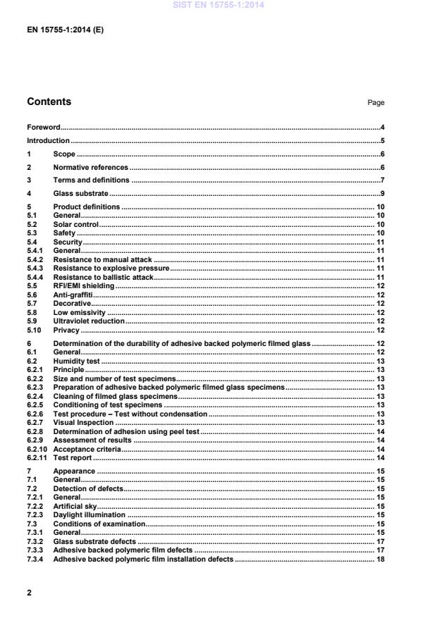 EN 410. EN 410 requires values to be given as decimals to two places. However, the UV transmittance shall be given to four decimal places in order to distinguish between these products and non-specialist films. 5.10 Privacy The purpose of applying an adhesive backed polymeric privacy film to a glass substrate is to reduce vision through the glass substrate. 6 Determination of the durability of adhesive backed polymeric filmed glass 6.1 General The durability of adhesive backed polymeric filmed glass is a combination of the durability of the adhesive backed polymeric film (as defined in EN 15752-1), the glass substrate surface, and the application of the adhesive backed polymeric film (see Annex A). NOTE The durability of the adhesive backed polymeric film (see EN 15752–1) will have been determined on applicable glass substrates. SIST EN 15755-1:2014