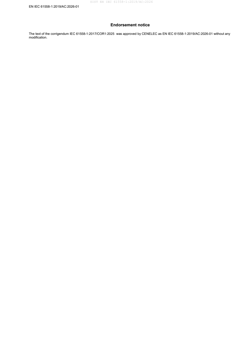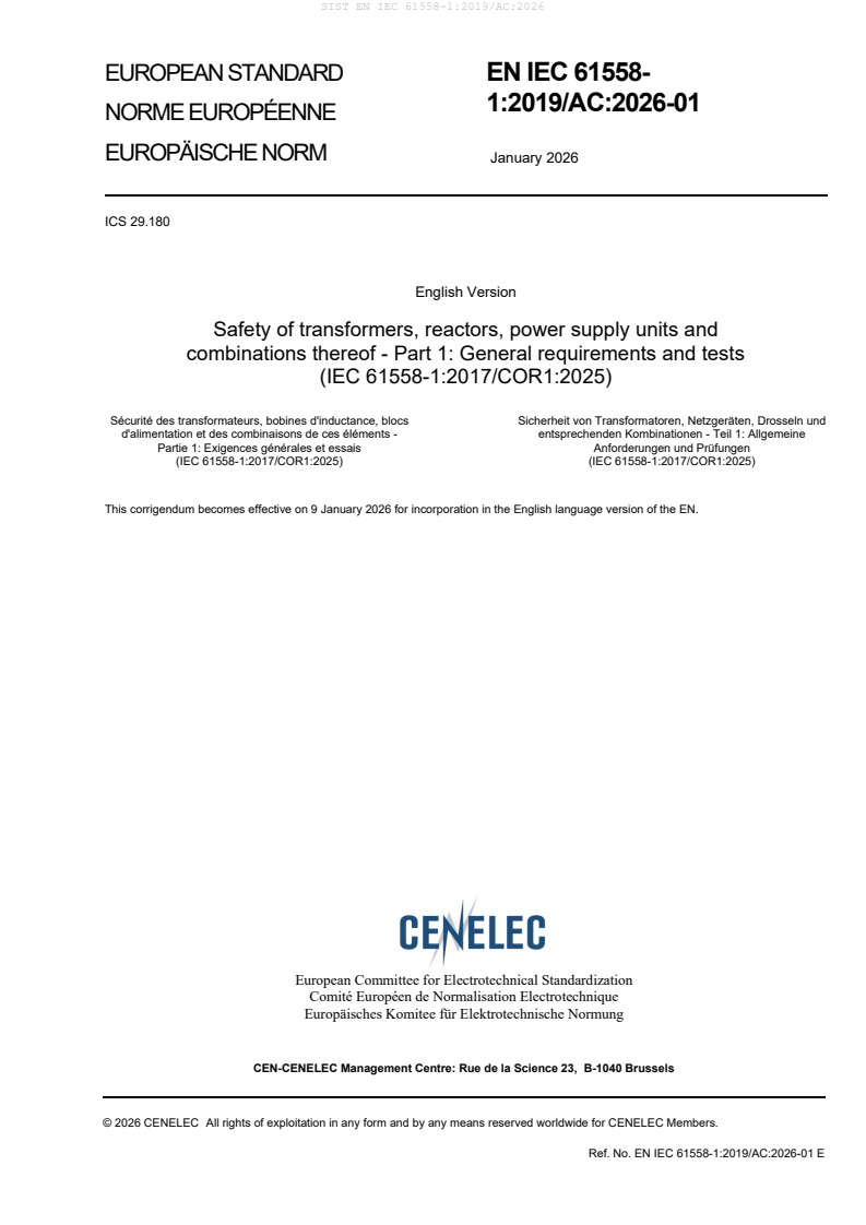 The text of the corrigendum IEC 61558-1:2017/COR1:2025 was approved by CENELEC as EN IEC 61558-1:2019/AC:2026-01 without any