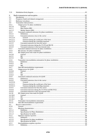 ETSI ETSI EN 300 392-2 V3.8.1 (2016-08) 5 6.5.3 Intermodulation response rejection . 100 6.5.3.1 Definition . 100 6.5.3.2 Specification for Phase Modulation . 100 6.5.3.3 Specification for QAM . 100 6.5.4 Unwanted conducted emissions . 101 6.5.4.1 Definition . 101 6.5.4.2 Specification. 101 6.5.5 Unwanted radiated emissions . 101 6.6 Transmitter/receiver performance for phase modulation . 101 6.6.0 General . 101 6.6.1 Transmitter performance for phase modulation . 101 6.6.1.1 Modulation accuracy for phase modulation . 101 6.6.1.2 Vector error magnitude requirement at symbol time for phase modulation . 102 6.6.2 Receiver performance for phase modulation . 103 6.6.2.0 General . 103 6.6.2.1 Nominal error rates for phase modulation . 103 6.6.2.1.1 Nominal error rates for π/4-DQPSK modulation . 103 6.6.2.1.2 Nominal error rates for π/8-D8PSK modulation . 103 6.6.2.2 Dynamic reference sensitivity performance for phase modulation . 104 6.6.2.2.0 General . 104 6.6.2.2.1 BS receiver performance . 104 6.6.2.2.2 MS receiver performance . 106 6.6.2.3 Receiver performance at reference interference ratios for Phase Modulation . 107 6.6.2.3.0 General . 107 6.6.2.3.1 BS receiver performance . 108 6.6.2.3.2 MS receiver performance . 109 6.6.2.4 Static reference sensitivity performance for phase modulation . 110 6.6.2.4.0 General . 110 6.6.2.4.1 BS receiver performance . 110 6.6.2.4.2 MS receiver performance . 111 6.6.2.5 MS receiver performance for synchronization burst acquisition . 112 6.7 Transmitter/receiver performance for QAM . 112 6.7.0 General . 112 6.7.1 Transmitter performance for QAM . 112 6.7.1.1 Modulation accuracy for QAM . 112 6.7.1.2 Vector error magnitude requirement at symbol time for QAM . 113 6.7.2 Receiver performance for QAM . 114 6.7.2.0 General . 114 6.7.2.1 Nominal error rates for QAM. 114 6.7.2.2 Dynamic reference sensitivity performance for QAM . 114 6.7.2.3 Receiver performance at reference interference ratios for QAM . 117 6.7.2.3.1 Adjacent channel interference . 117 6.7.2.3.2 Co-channel interference . 117 6.7.2.4 Static reference sensitivity performance for QAM . 118 6.7.2.5 MS receiver performance for frequency correction burst acquisition on a DA cell . 118 6.8 Propagation conditions . 118 6.8.0 General . 118 6.8.1 Propagation conditions - introduction . 118 6.8.2 Tap-gain process types . 119 6.8.3 Propagation models. 120 7 Radio sub-system synchronization . 121 7.1 Introduction . 121 7.2 General description of synchronization system . 121 7.3 Timebase counters for phase modulation . 121 7.3.1 Timing counters for phase modulation . 121 7.3.2 Values of the counters for phase modulation . 121 7.4 Timing of phase modulation signals . 122 7.5 Timebase counters for QAM . 122 7.5.1 Timing counters for QAM . 122 7.5.2 Values of the counters for QAM . 122 7.6 Timing of QAM signals . 123 SIST EN 300 392-2 V3.8.1:2016