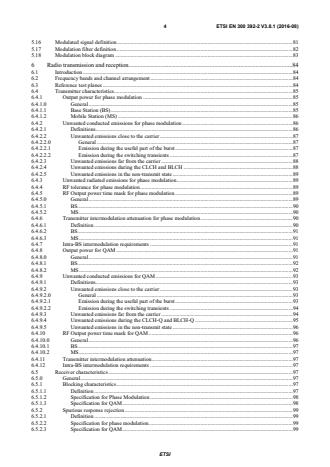 ETSI ETSI EN 300 392-2 V3.8.1 (2016-08) 4 5.16 Modulated signal definition . 81 5.17 Modulation filter definition . 82 5.18 Modulation block diagram . 83 6 Radio transmission and reception . 84 6.1 Introduction . 84 6.2 Frequency bands and channel arrangement . 84 6.3 Reference test planes . 84 6.4 Transmitter characteristics. 85 6.4.1 Output power for phase modulation . 85 6.4.1.0 General . 85 6.4.1.1 Base Station (BS) . 85 6.4.1.2 Mobile Station (MS) . 86 6.4.2 Unwanted conducted emissions for phase modulation . 86 6.4.2.1 Definitions . 86 6.4.2.2 Unwanted emissions close to the carrier . 87 6.4.2.2.0 General . 87 6.4.2.2.1 Emission during the useful part of the burst . 87 6.4.2.2.2 Emission during the switching transients . 87 6.4.2.3 Unwanted emissions far from the carrier . 88 6.4.2.4 Unwanted emissions during the CLCH and BLCH . 88 6.4.2.5 Unwanted emissions in the non-transmit state . 89 6.4.3 Unwanted radiated emissions for phase modulation . 89 6.4.4 RF tolerance for phase modulation . 89 6.4.5 RF Output power time mask for phase modulation . 89 6.4.5.0 General . 89 6.4.5.1 BS . 90 6.4.5.2 MS . 90 6.4.6 Transmitter intermodulation attenuation for phase modulation . 90 6.4.6.1 Definition . 90 6.4.6.2 BS . 91 6.4.6.3 MS . 91 6.4.7 Intra-BS intermodulation requirements . 91 6.4.8 Output power for QAM . 91 6.4.8.0 General . 91 6.4.8.1 BS . 92 6.4.8.2 MS . 92 6.4.9 Unwanted conducted emissions for QAM . 93 6.4.9.1 Definitions . 93 6.4.9.2 Unwanted emissions close to the carrier . 93 6.4.9.2.0 General . 93 6.4.9.2.1 Emission during the useful part of the burst . 93 6.4.9.2.2 Emission during the switching transients . 94 6.4.9.3 Unwanted emissions far from the carrier . 94 6.4.9.4 Unwanted emissions during the CLCH-Q and BLCH-Q . 95 6.4.9.5 Unwanted emissions in the non-transmit state . 96 6.4.10 RF Output power time mask for QAM . 96 6.4.10.0 General . 96 6.4.10.1 BS . 97 6.4.10.2 MS . 97 6.4.11 Transmitter intermodulation attenuation . 97 6.4.12 Intra-BS intermodulation requirements . 97 6.5 Receiver characteristics . 97 6.5.0 General . 97 6.5.1 Blocking characteristics . 97 6.5.1.1 Definition . 97 6.5.1.2 Specification for Phase Modulation . 98 6.5.1.3 Specification for QAM . 98 6.5.2 Spurious response rejection . 99 6.5.2.1 Definition . 99 6.5.2.2 Specification for phase modulation . 99 6.5.2.3 Specification for QAM . 99 SIST EN 300 392-2 V3.8.1:2016