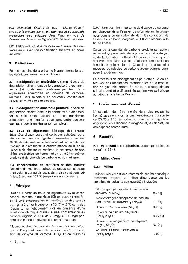 ISO 11734:1995 - Qualité de l'eau -- Évaluation de la biodégradabilité anaérobie "ultime" des composés organiques dans les boues de digesteurs -- Méthode par mesurage de la production de biogaz
