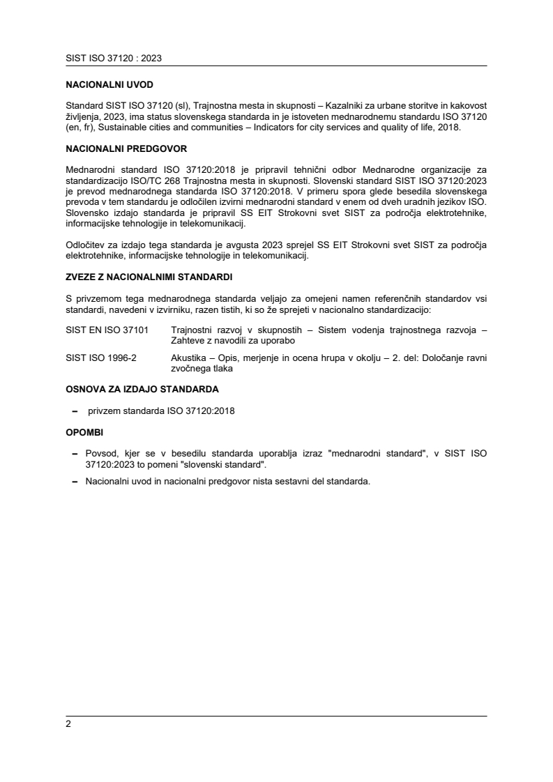 SIST ISO 37120:2023 - "Sustainable cities and communities - Indicators for city services and quality of life" is the Slovenian adoption of ISO 37120 (second edition, 2018). The standard defines a standardized set of urban indicators and rigorous methodologies to measure city services and quality of life in a comparable and verifiable way. It is applicable to any city, municipality or local government, irrespective of size or location, and is intended to support performance measurement, benchmarking and strategic planning.