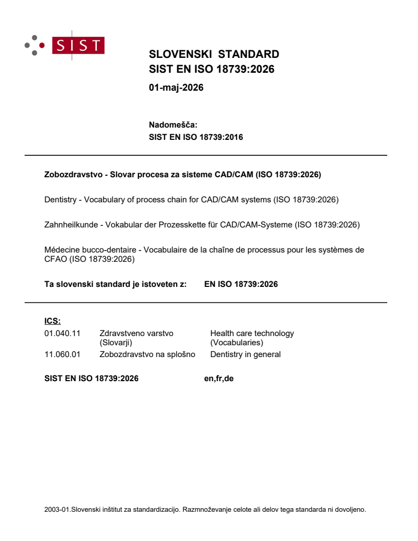 SIST EN ISO 18739:2026 is a standard published by the Slovenian Institute for Standardization (SIST). Its full title is "Dentistry - Vocabulary of process chain for CAD/CAM systems (ISO 18739:2026)". This standard covers: This document defines terms and definitions used in the process chain for computer-aided design and computer-aided manufacturing (CAD/CAM) systems in dentistry. NOTE: See Annex A for a flow chart of the process chain.