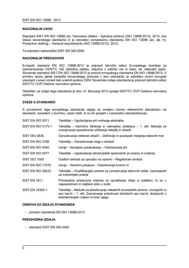 SIST EN ISO 13688:2013 has the following relationships with other standards: It is inter standard links to SIST EN 340:2004, SIST EN ISO 13688:2013/A1:2021. Understanding these relationships helps ensure you are using the most current and applicable version of the standard.